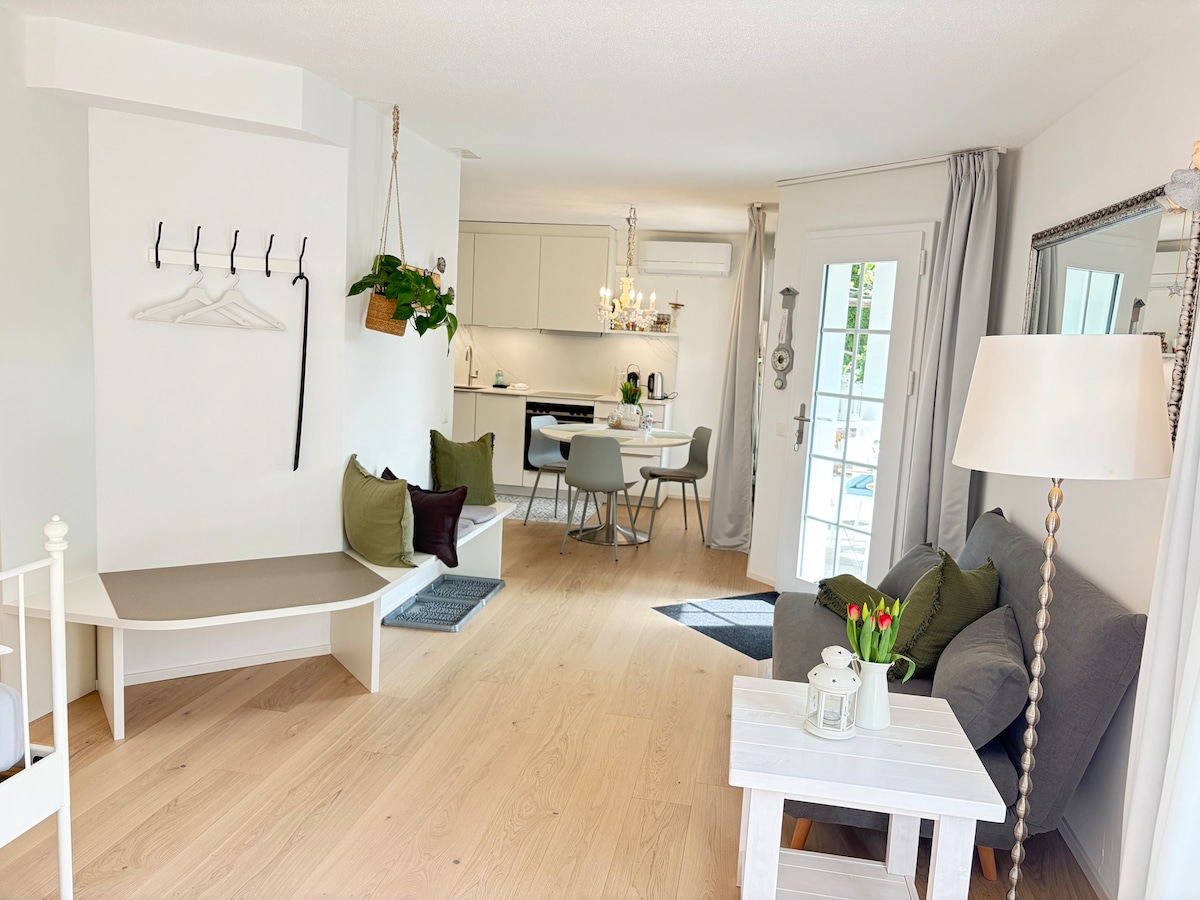 Gesamtes Apartment mit eigener Dachterrasse, spektakuläre Aussicht auf See und Berge, nach Südwesten ausgerichtet. Einzigartige Ruhe am Ende einer Sackstrasse ohne Verkehr. Moderne private Eigentumswohnung (90m²), separater Eingang. Neubau, Erstvermietung 2024. Schlafzimmer mit Kingsize Bett, Wohnzimmer als zweites Schlafzimmer, hochwertige Küche, Wintergarten mit Esstisch. Kostenlose private Parkplätze am Haus. Klimaanlage. Strand-/Seezugang nahe. Terrazzo mit Fussbodenheizung.