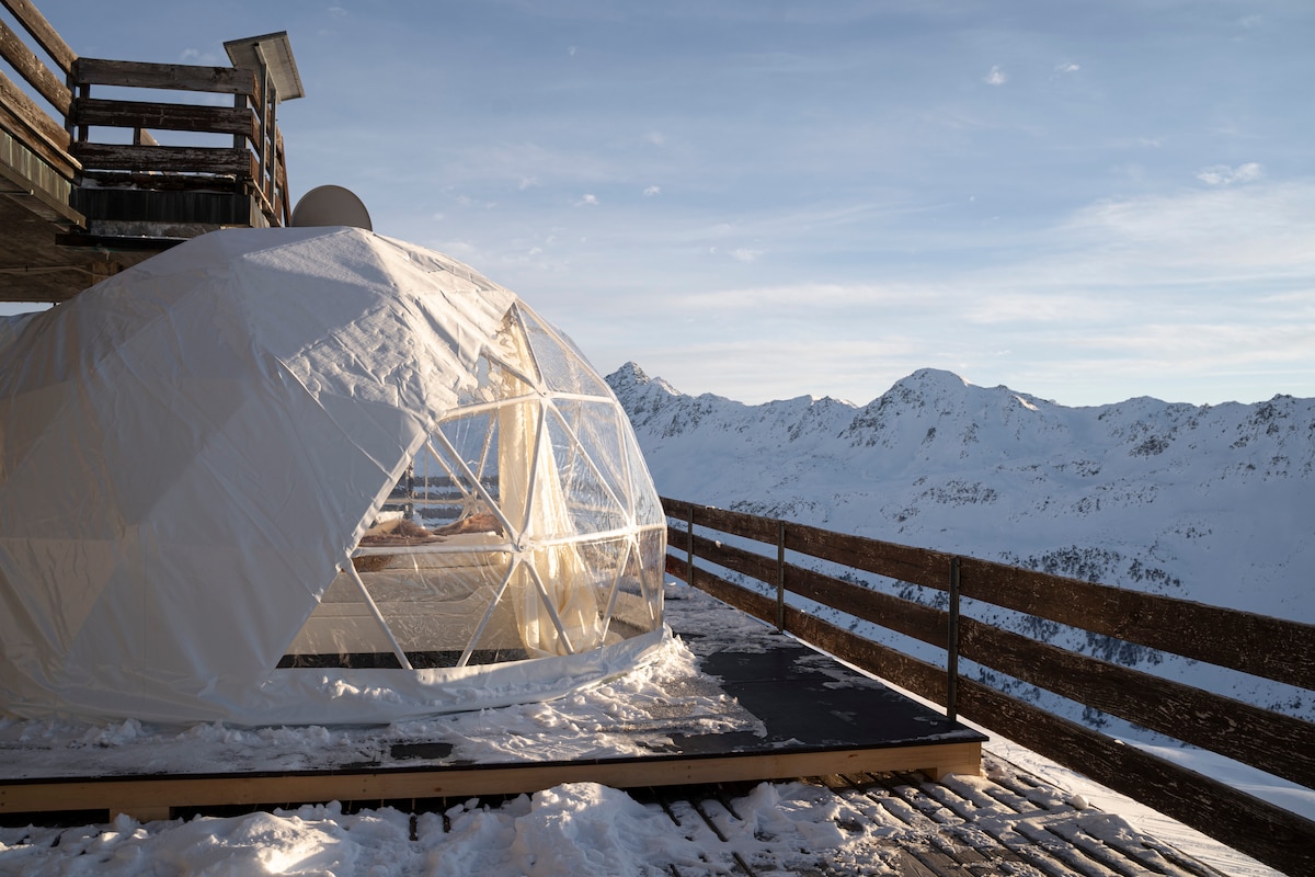 Dome with Hotpot, Breakfast & Panoramic View – Val Lumnezia Enjoy an unforgettable night in our semi-transparent Bubble Suite at 1,800 m above sea level – with mountain views, breakfast included, and access to the hotpot. The front offers a stunning panorama, while the back provides privacy thanks to a thoughtfully placed screen. Accessible on foot or by mountain cable car (seasonal operation).