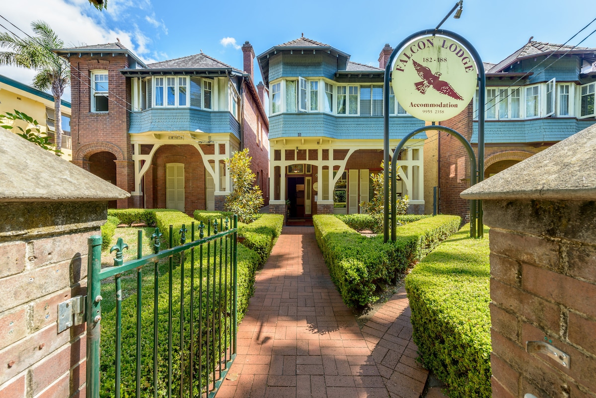 Falcon Lodge provides boutique style medium and long-term accommodation close to Sydney and North Sydney CBD. Comprising 94 rooms in four renovated Federation Houses, Falcon Lodge is located in a secure, clean and friendly environment, set amongst beautiful gardens and opposite tranquil St Leonards Park in North Sydney. All rooms are fully furnished and have access to plentiful communal kitchens and bathrooms. Weekly linen service plus an onsite laundry are added features.