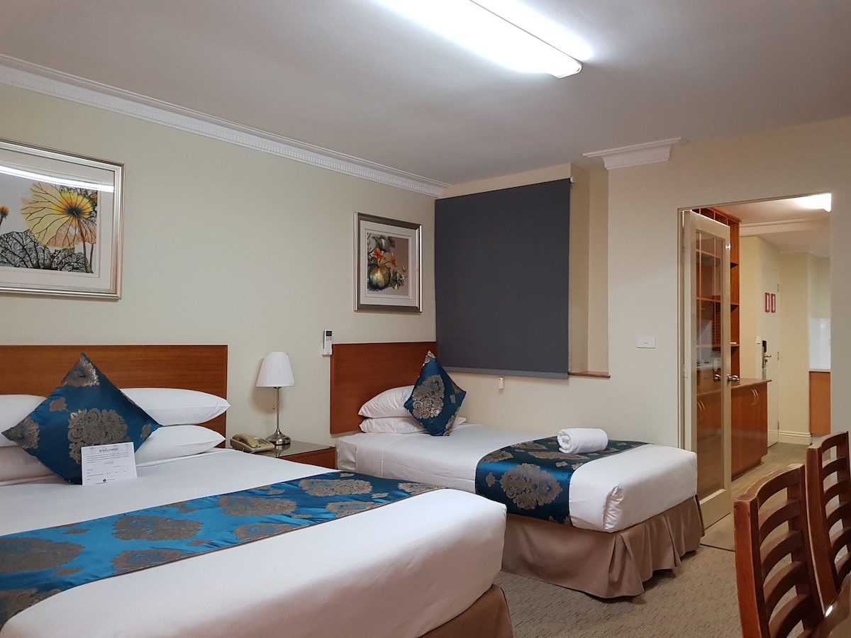 Executive Family Room has one room with one queen size bed, another room has two single beds, both room has air conditioning, desk, carpet, wardrobe/closet, ensuite, hairdryer, free toiletries, telephone, tea/coffee making facilities, flat-screen TV, minibar, electric kettle, wake-up call service, towels, linens, free WIFI is available in all rooms and public areas (High Speed Access available @ AUD$10 per day). room size 32 SQM.