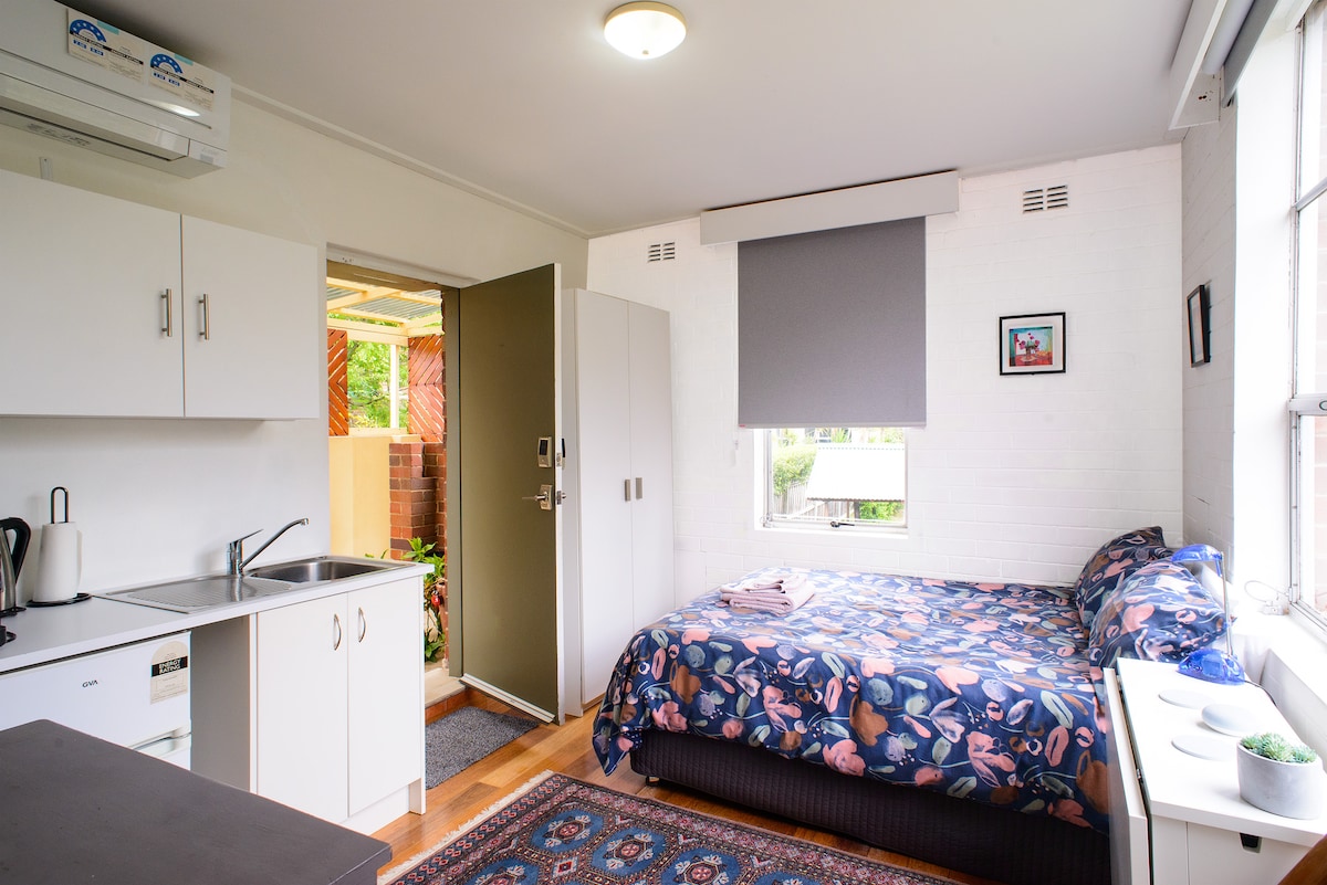 Private entry to queen size room with private ensuite bathroom and mini kitchenette. Mini fridge, jug, toaster and microwave. (Does not have oven or hot plates/cooking hob). Quiet leafy outlook on culdesac street. Constiata doors overlook our private garden and pool. Peaceful, leafy quiet sanctuary. 2 min to train, bus, restaurants and bars. Internet access. Please also be advised the entrance sliding door is also used by elderly mother and not lockable. Bedroom is lockable.
