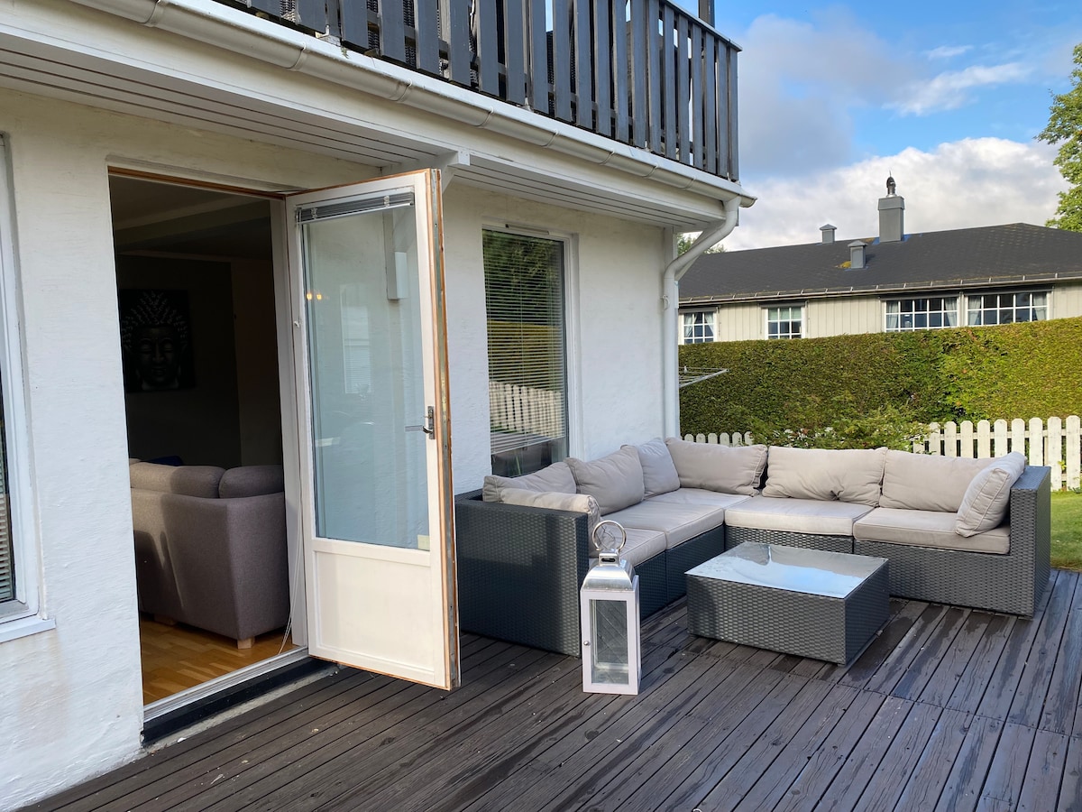 Light and nice apartment, 50 m2. Lovely surroundings! Perfect place for hiking and relaxing. Private entrance and private patio outside. Free parking outside the house. One bedroom with double bed and one single bed. 12 min walk to bus stop, 23 min bus ride to Oslo. 4 km to Sandvika, 8 km to Asker. Quiet and peaceful neighborhood. Sea view, a few meters to jetty and beaches. Rent single/double kayak. Bikes, fishing gear and tennis gear available for free.