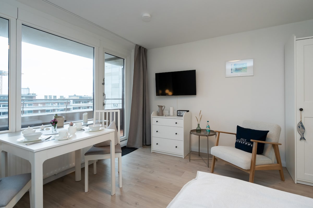 Dieses kleine und sehr feine Feriendomizil für 2 Personen erwartet reiselustige Gäste. Die ideale Lage in Strand- und Stadtnähe verspricht einen abwechslungsreichen, entspannten und angenehmen Urlaub, in dem man auf nichts verzichtet muss. Der kuschelige Wohn-und Schlafbereich verfügt über einen Flachbild-Tv, 2 Schrankbetten und einem sonnigen Balkon mit Sitzmöbeln. Die separate Küche hält alles bereit was man für einen fürstlichen Start in den Tag benötigt.
