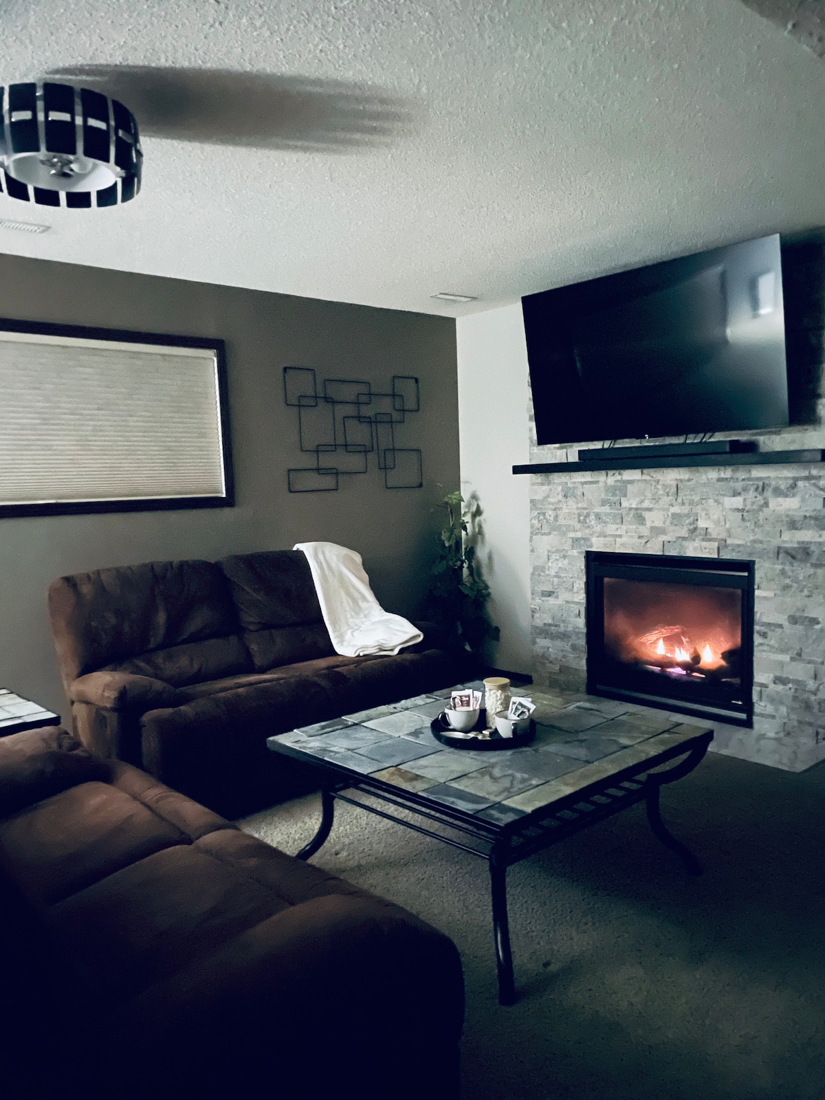 Find your stay at the Hidden Gem! A unique, peaceful basement hideaway with all the themed charm of a beautiful mountain cabin. Enjoy the luxury of a King bed in the primary bedroom, or stay in the cabin-themed second queen bedroom. In the spacious living room, cozy up on the recliner sectional in front of the electric fireplace & 50” TV. Start your day at the coffee bar, prepare meals in a fully equipped kitchenette & end your day relaxing in the 6-foot soaker tub!
