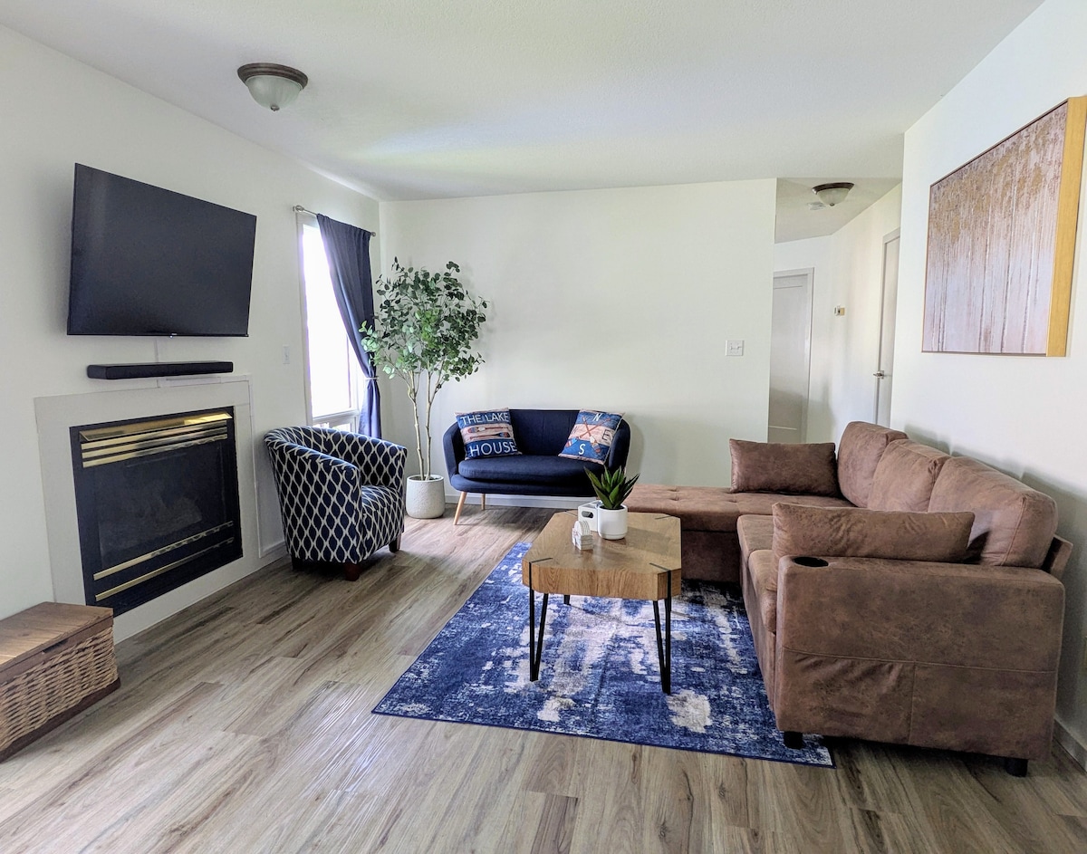 This cozy 2-bedroom, 1-bath home sleeps 5-6 people and is perfect for family getaways! Just a 10-minute walk to Lakeshore Drive, you’ll be close to the lake, local shops, and outdoor activities. The spacious backyard is great for relaxing, with a trampoline, outdoor games, a fire pit for cozy evenings, and a BBQ for easy family meals. Inside, you'll find a comfortable space with all the modern amenities you need for a stress-free stay. Everything you need is right here!