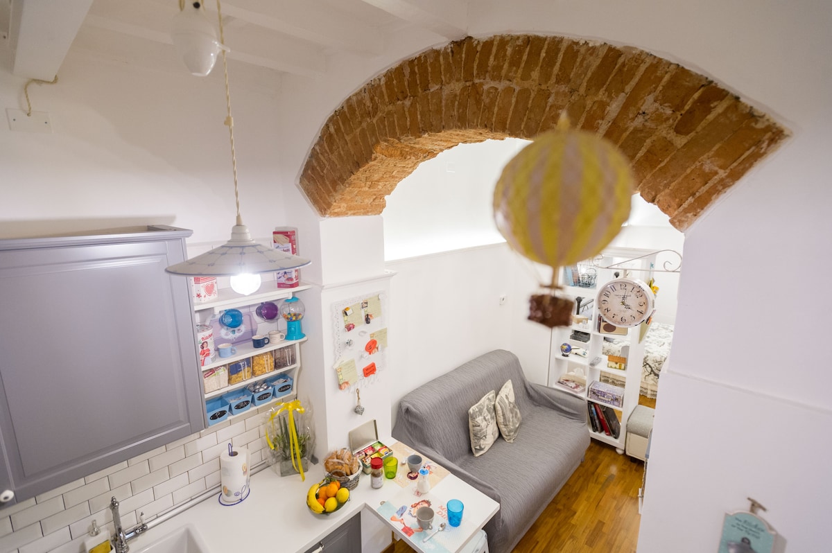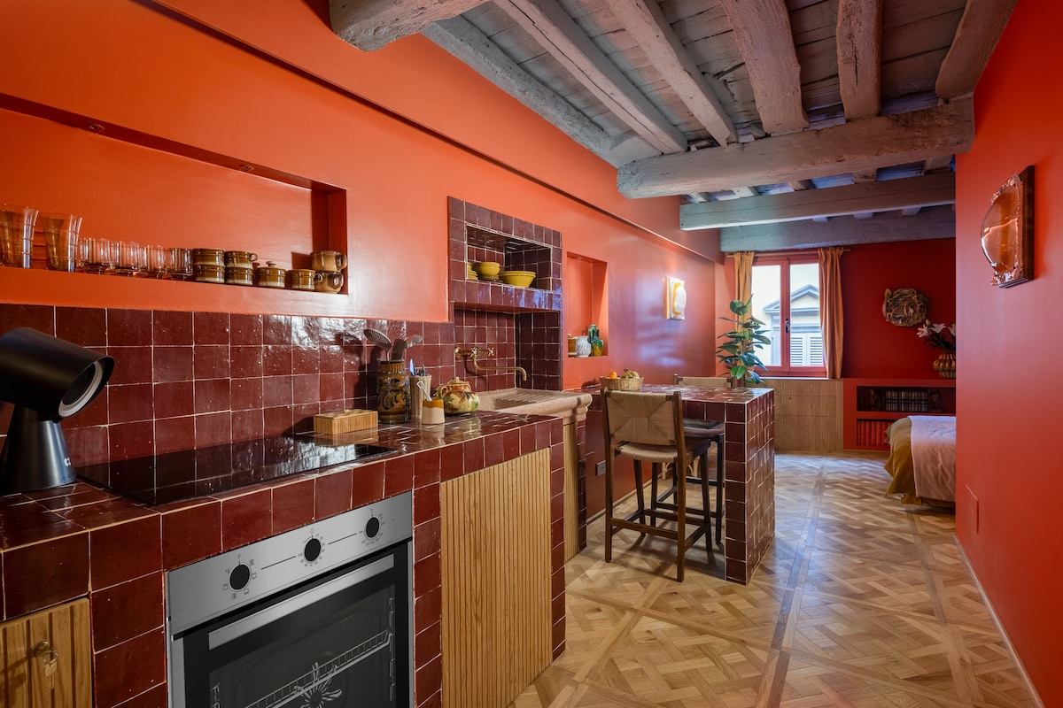 Featured by Vogue USA among the Top 18 Airbnbs in Italy and the Top 12 in Florence, and mentioned by other travel magazines, the apartment is on the third floor of a 16th-century building with no elevator, bright with a rooftop view With checkerboard terracotta floors and handmade blue tiles, it blends historic charm and modern comfort It is located in Borgo Pinti, just steps from Florence’s main attractions It includes a bedroom and a large living room with kitchen, for 550 sq. ft. in total