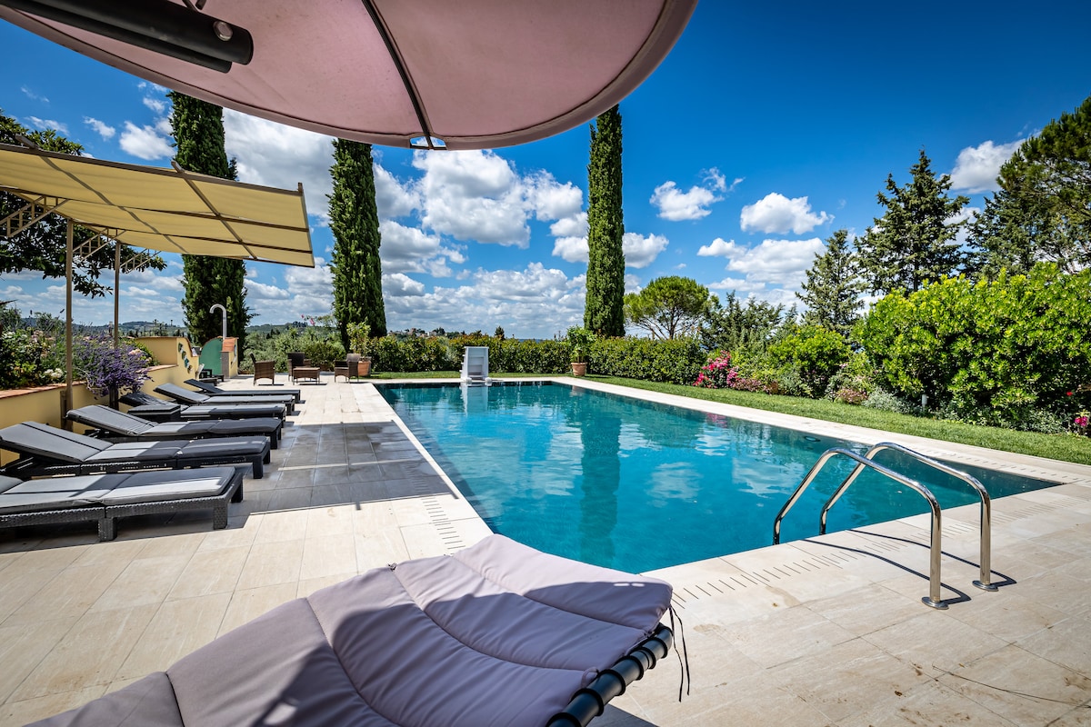 Elegant and charming villa with view located on top of a hill a few kilometers from Florence Cathedral. In total the property can host 18 guests. A/C in 5 bedrooms 6 bathrooms internet wi-fi gratuito, fast not included heat and electricity