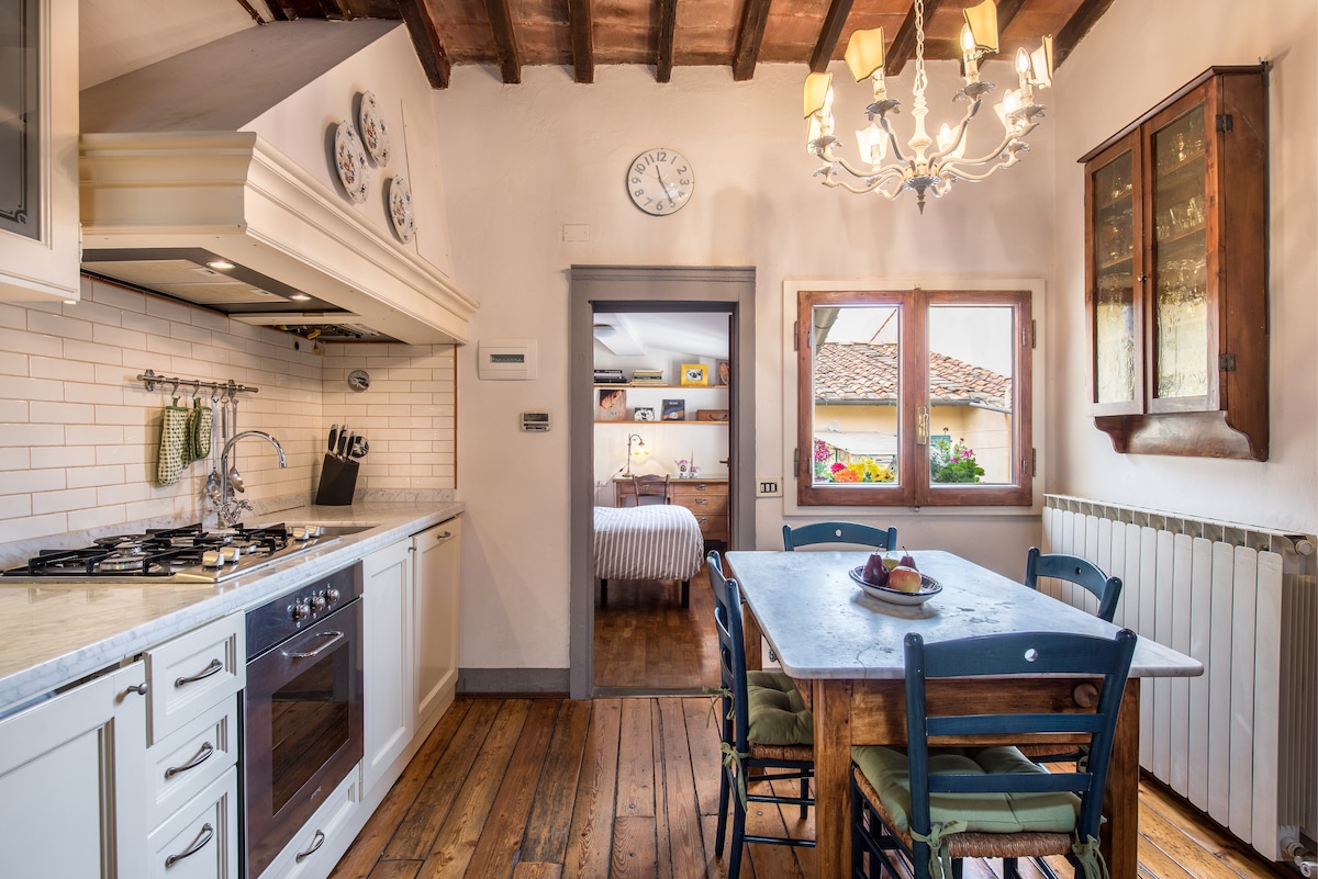Located in the lively neighborhood of Sant Ambrogio, nearby S. Maria del Fiore and S-Croce, the flat has the characteristic florentine style, with travi a vista, parquet, view on the rooftops and two nice caminetti. It has two bedrooms, kitchen, wifi, air conditioning . It is ideal for maximum 4 for persons. As almost all the ancient buildings/palaces it has no elevator, but at your arrival you will be surrounded by a unique atmosfera, heartfelt and romantic!
