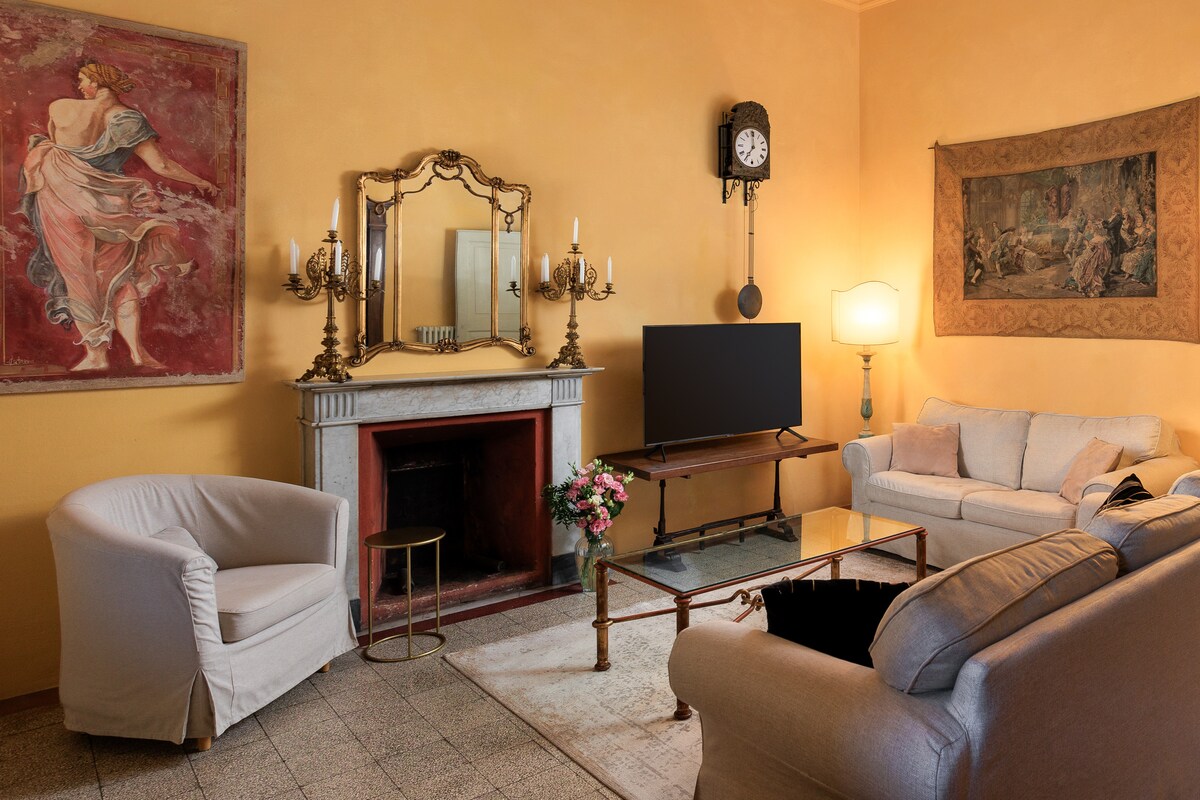 It's on the first floor and it's the old noble flat. It looks on the house garden and it's decorated with paintings and furnishings of the 19th century. A hallway connects the large living room, the two bedrooms, the kitchen and the two bathrooms. beautiful Italian garden accessible to all guests of the building.