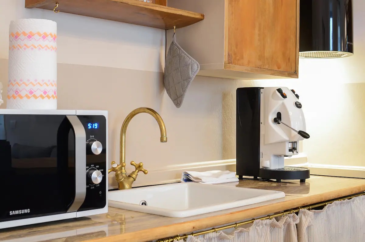 This is a a cozy one-bedroom apartment on a single level, ideal for families. It has a living room with a double sofa bed, a small kitchen with a high chair for children, a bedroom with a double bed, and an additional armchair bed. It features a unique bathroom with a shower and a private courtyard. In shades of green, with soft furnishings and natural fabrics, in respect of its historicity, the ancient wooden coffered ceiling from the 1700s has been preserved in the living room.