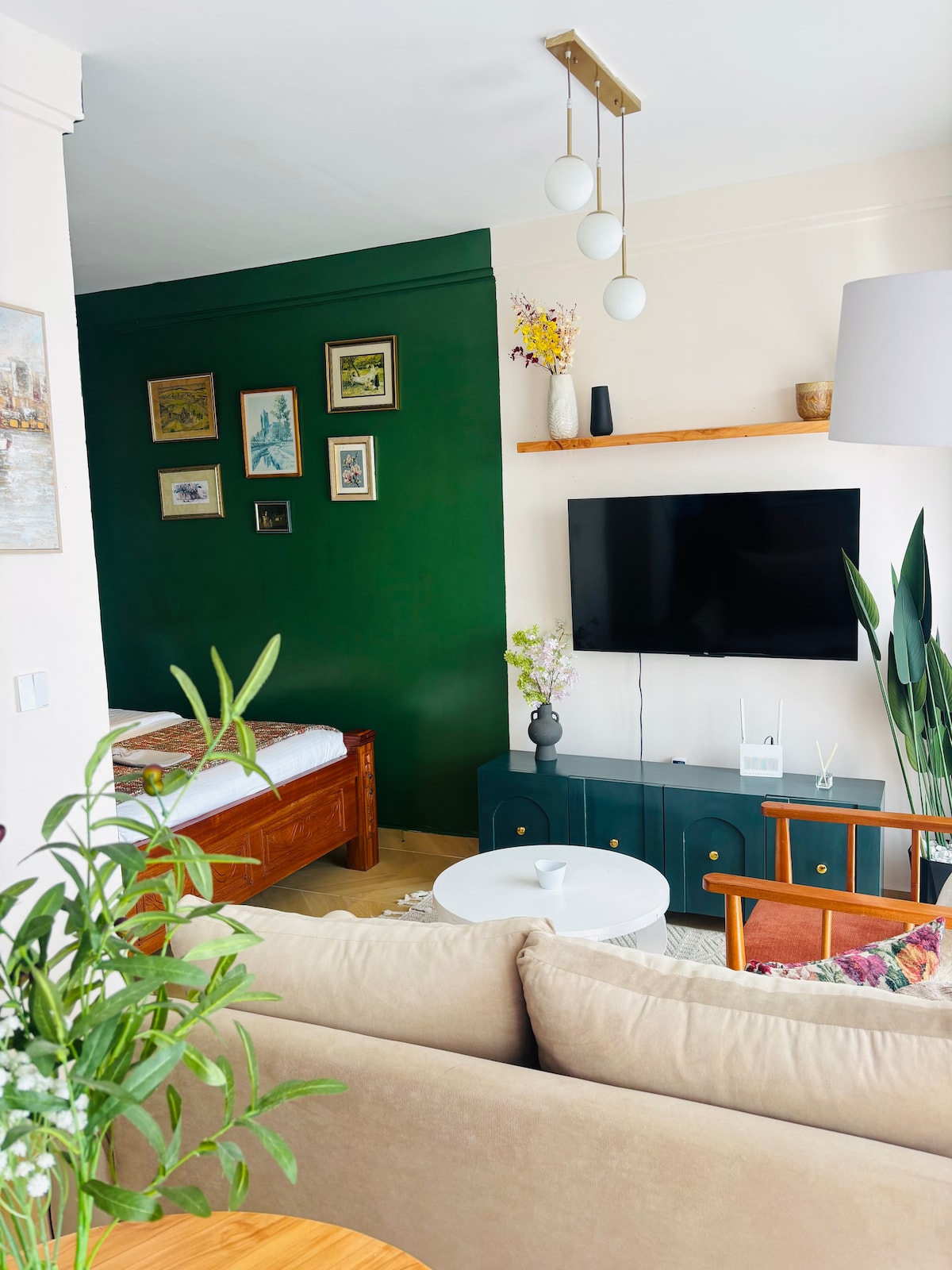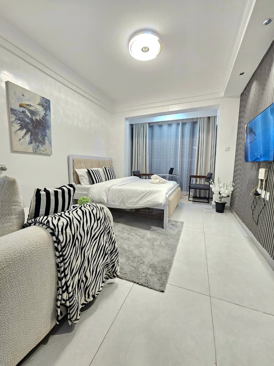 Afri-Naze Home promises to provide comfort and unrivalled experience leaving you yearning for more. This thoughtfully designed apartment features vibrant décor, curated artwork, and comfortable furnishings that celebrate Africa’s rich heritage. The compact layout includes a fully equipped kitchenette, a serene bedroom with a plush queen-sized bed, and a modern bathroom facilities. Just 15 minutes away from JKIA,SGR and the Nairobi National Park.