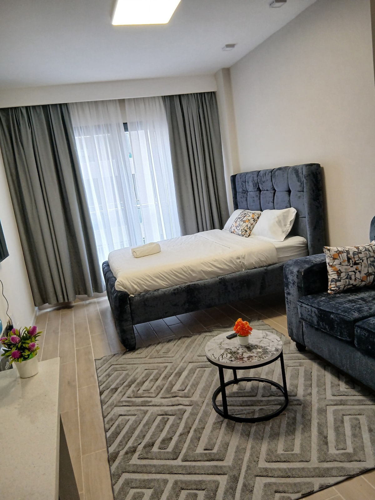 LeyCar One bedroom at Newrise Gardens is a stylish guesthouse in Nairobi offering twin rooms with private balconies, free WiFi, flat-screen TVs, and kitchenettes. Guests enjoy access to a garden, terrace, swimming pool, and gym. Conveniently located near Nairobi SGR Terminus and Jomo Kenyatta International Airport, it’s perfect for business and leisure travelers. Hosted by Carol, the property combines vintage charm with modern comfort, creating a cozy “home away from home.”