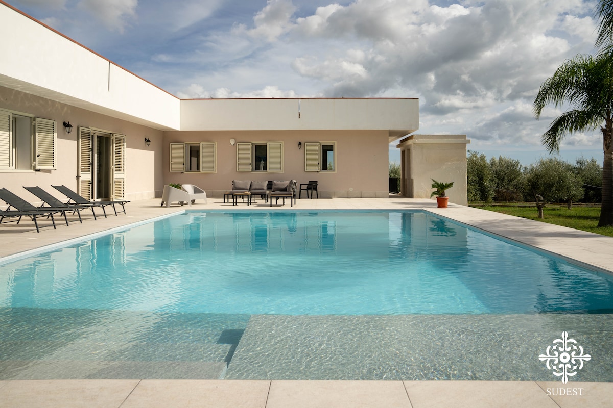 Newly renovated villa immersed in the countryside of Noto with breathtaking views of the sea and Mount Etna. For the exclusive use of guests, the large swimming pool (16x4m), 15,000m2 garden,500m2 outdoor courtyard equipped with gas barbecue, 6 sun loungers, table and shower. The villa, characterized by a mix of modernity and tradition, consists of a living room, kitchen, dining room, 2 double bedrooms, 2 bathrooms, 1 guest bathroom, a large study in which there is a double sofa bed and laundry.