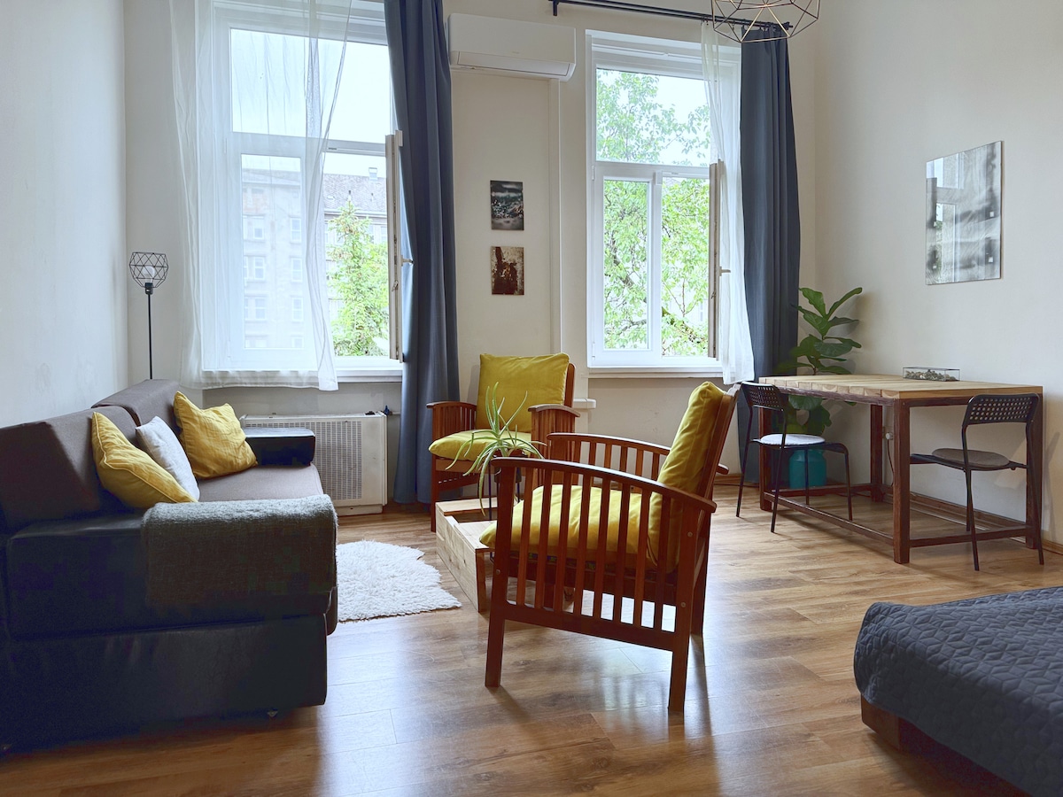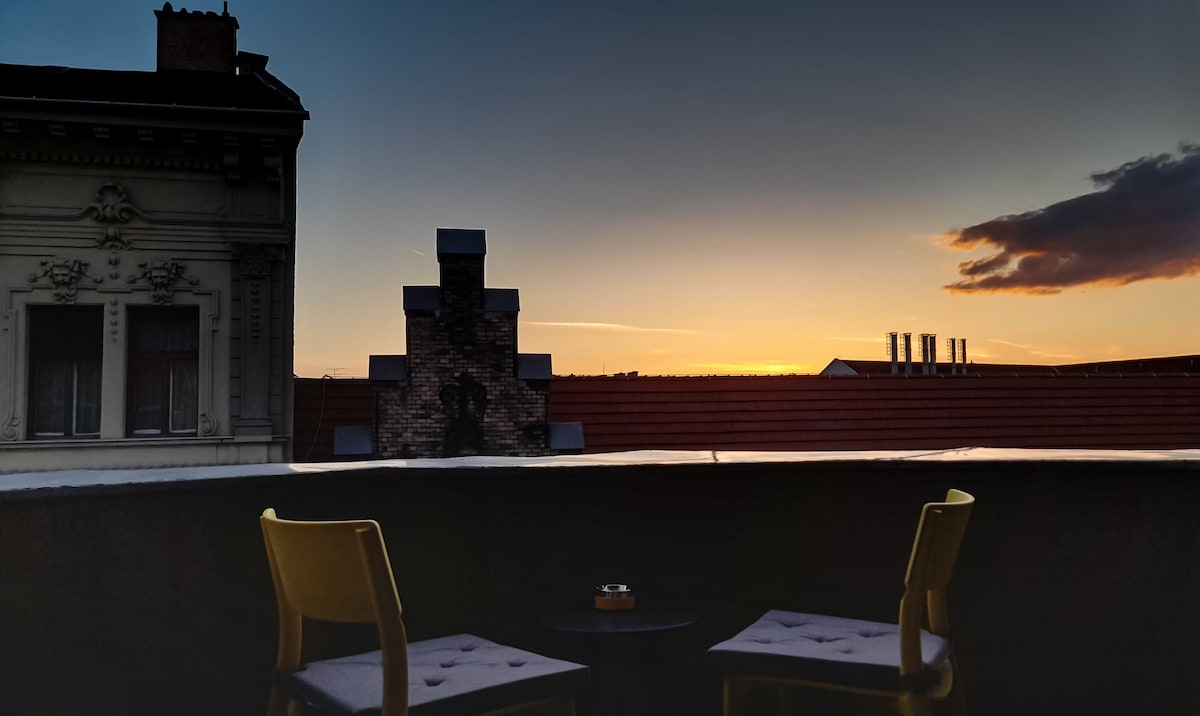 This spacious and cozy, stylish, full-equipped apartment (apt) was renovated and furnished to a high standard. The apt is on the highest (4th) floor in the building (with elevator) and it has an amazing panoramic view from the balcony :) We are committed to provide to our guests all the equipment that make your stay as comfortable as it can be desired. The apt is located in the very center of Palace District, 3 mins walking distance from Blaha Lujza square (metro 2, 4/6 tram - 24/0), buses.