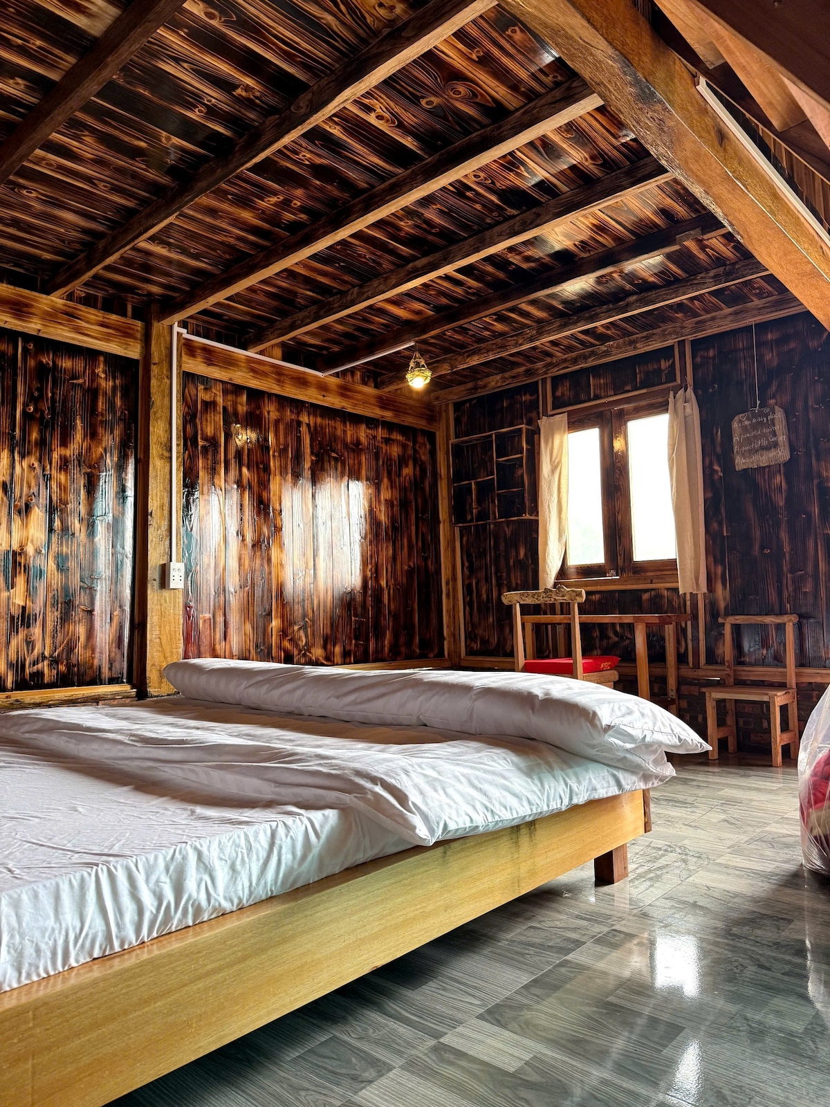 Inspired by the Hoang Lien mountain range, this house, with its dark, charred wood, exudes warmth, tranquility, and peace. Its rustic beauty is enhanced by sturdy pine wood and warm red brick. Natural light filters through small windows. A charming mezzanine offers a peaceful sleeping space, while the cozy living area below creates a warm atmosphere for gathering and sharing. Inside, the bathroom provides privacy and comfort. A place not just to live, but to remember forever!🥰❤