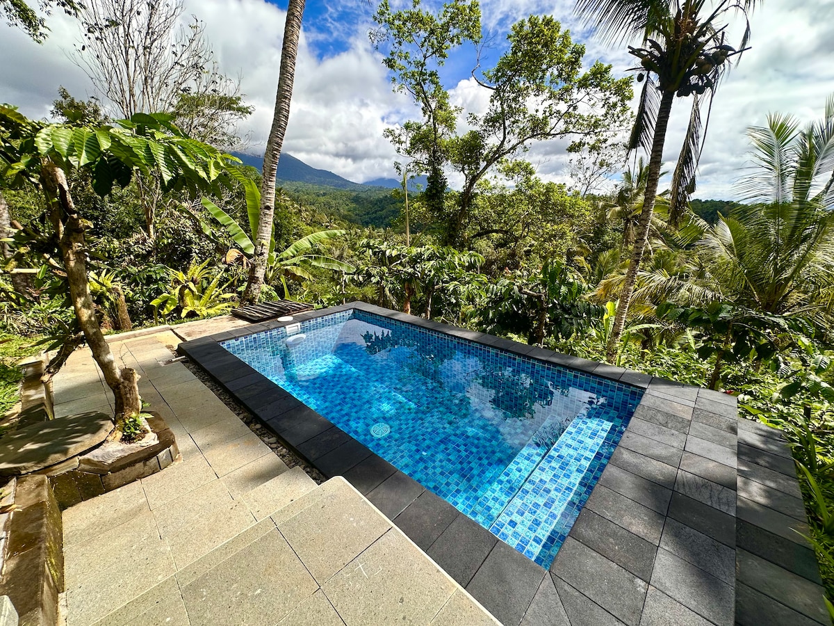 Experience luxe living in our Balinese tree house, nestled amidst the verdant countryside. This luxury cabin, resembling a tiny home, boasts an impeccable design that seamlessly blends with nature. Wake up to an amazing view of majestic mountains, right from your bed. Relax in the unique outdoor bathtub, surrounded by the serene whispers of the jungle. Feast on delightful BBQs on the private deck, set against a panoramic backdrop. Dive into the essence of Bali – where luxury meets the wild.