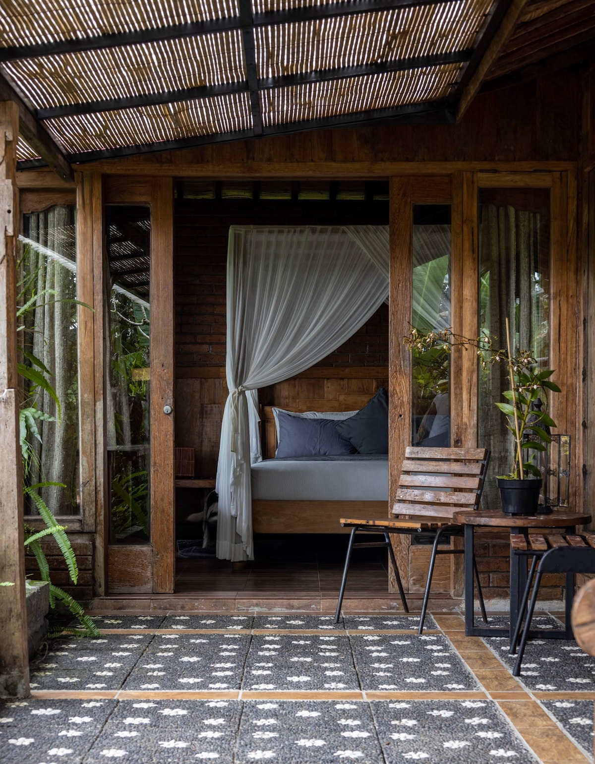 Escape hectic Bali to rural serenity at Desa Cabins: our intimate getaway for adult couples or solo travelers. Our chic A-frame cabins offer lofi barefoot luxury immersed in a beautiful coconut grove, surrounded by verdant rice paddies with sweeping ocean and mountain views. Guest favs include: yoga, beach walks, leisurely breakfasts, dips in the pool watching the rice farmers at work, massages, sketching, sunset drinks, falling asleep to crashing waves, waking up to sounds of birdlife.