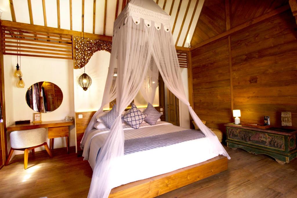 Located in 70 Ares Tropical Garden in the heart of Authentic Bali , The master villa is the biggest of the 5 ensuite luxury rooms of the Prana Lodge . Facing the Indian Ocean the villa combines the best of South East Asian aesthetic and modern life confort- It has it own fully equipped private kitchen in a beautiful traditional Geladak Its 25m infinity pool overflowing into the paddy fields and the turquoise waves of the Indian Ocean .