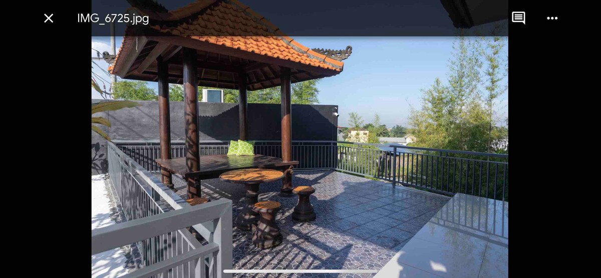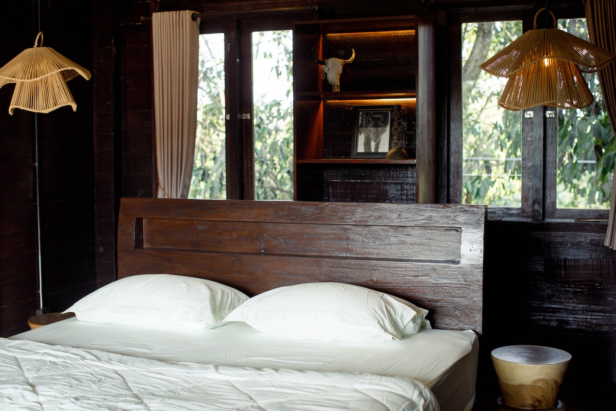 A private wooden pool villa with private kitchen and air conditioning. Wifi connection is available. Great place for family or group of 6. Also perfect remote location for travellers while working remotely. Resort service is available such as breakfast, lunch, dinner at the onsite restaurant, with free access to Umadhatu Waterpark everyday. Laundry service is available. Tour desk and transportation is available based on given information from the front office.