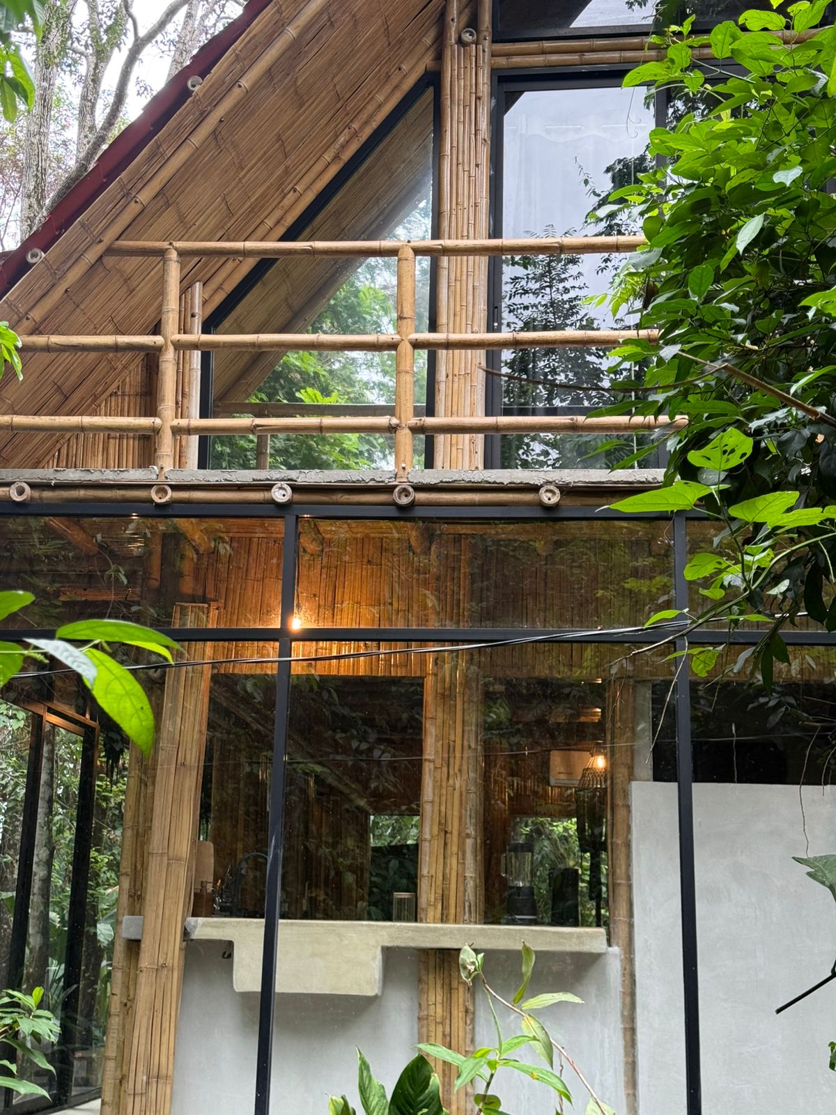 Cabaña de bambú de 2 plantas, muy luminosa, con amplios espacios e increíbles vistas desde sus ventanales. Ubicada frente a cascada natural, dentro de una propiedad privada.