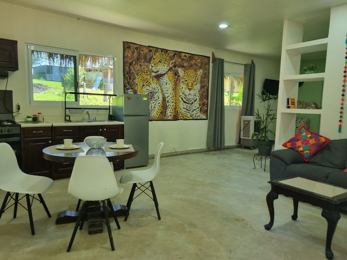 Desconecta tus preocupaciones en este espacio amplio y sereno. Este departamento de 3 habitaciones tiene todo para que pases unos días de descanso y lujo, compartiendo con la naturaleza escenarios naturales . Céntrico y bien comunicado. Pero a la vez rodeado de selva. Podrás ver monos, aves y las estrellas. Una gran opción para Palenque.