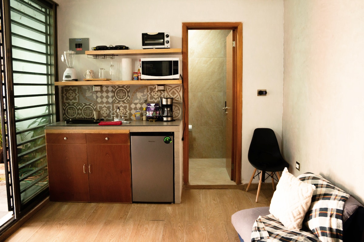 Loft independiente con entrada automatizada, en planta alta, cuenta con aire acondicionado, wifi de 100mbps y netflix. Tiene cocina con estufa, refrigerador y utensilios. No se comparte ningún área.