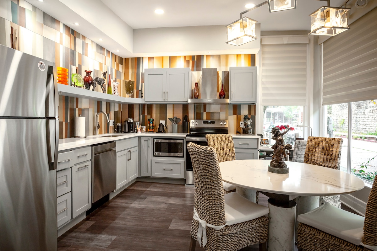 Luxury Spring Street apartment located in downtown Eureka Springs. Wood stairs lead down to the private apartment, located one level below street level. The suite is meant as a private luxury getaway, showcasing original art work, with a King-sized bed, full kitchen, washer/dryer, hot tub, and deluxe bathroom with walk-in shower. Whether you decide to tour downtown Eureka Springs or enjoy the view of Christ of the Ozarks from the private patio, this apartment is meant to be an indulgent recluse.