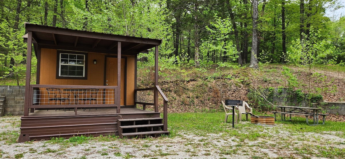 Mini Cabin # 3 sits on 90 Acres of Campground in the Beautiful Ozark Mountains! Cabin #3 comes with a Queen Bed, a Small Fridge, Microwave, Coffee Pot and a Full Private Bathroom, a BBQ grill in the back and a Picnic Table with a Fire Pit in the Front. The T.V 's are for watching movies only, no reception. We do keep movies in the office for guests that can be checked out during office hours. There is a full kitchen area that is available for a separate fee. (Ask for details) These mini cabins are in a group of four that are connected with a large front porch and walkways between each cabin.
