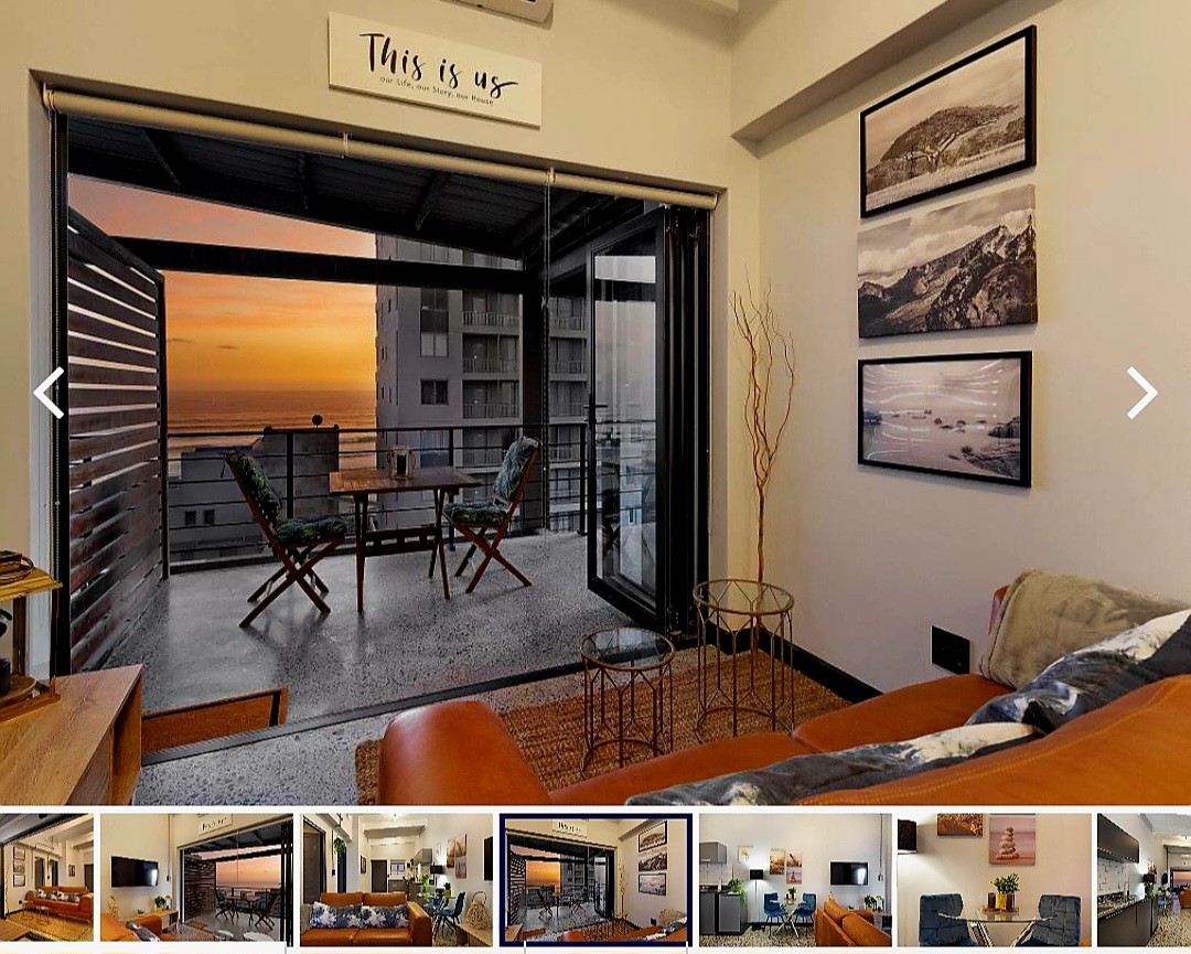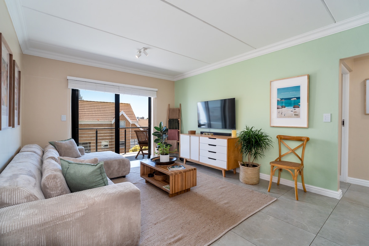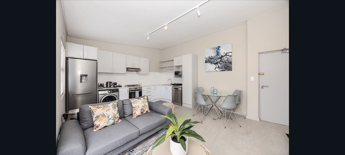 5min Walk from the beach and many amazing restaurants. 5min walk to Woolies, Pick'nPay and a delicious home made food service. Top floor, modern, new apartment with an open plan kitchen, lounge with separate bathroom (shower only). Smart TV(Netflix and DSTV) uncapped WIFI. Bedroom/Queen bed. Mini gas Weber BBQ on balcony. Kitchen has washing machine, gas stove and oven. A secure undercover parking and 3min walk from bus stop. Cycle path 1 street up. (No elevator) BACK UP POWER AVAILABLE