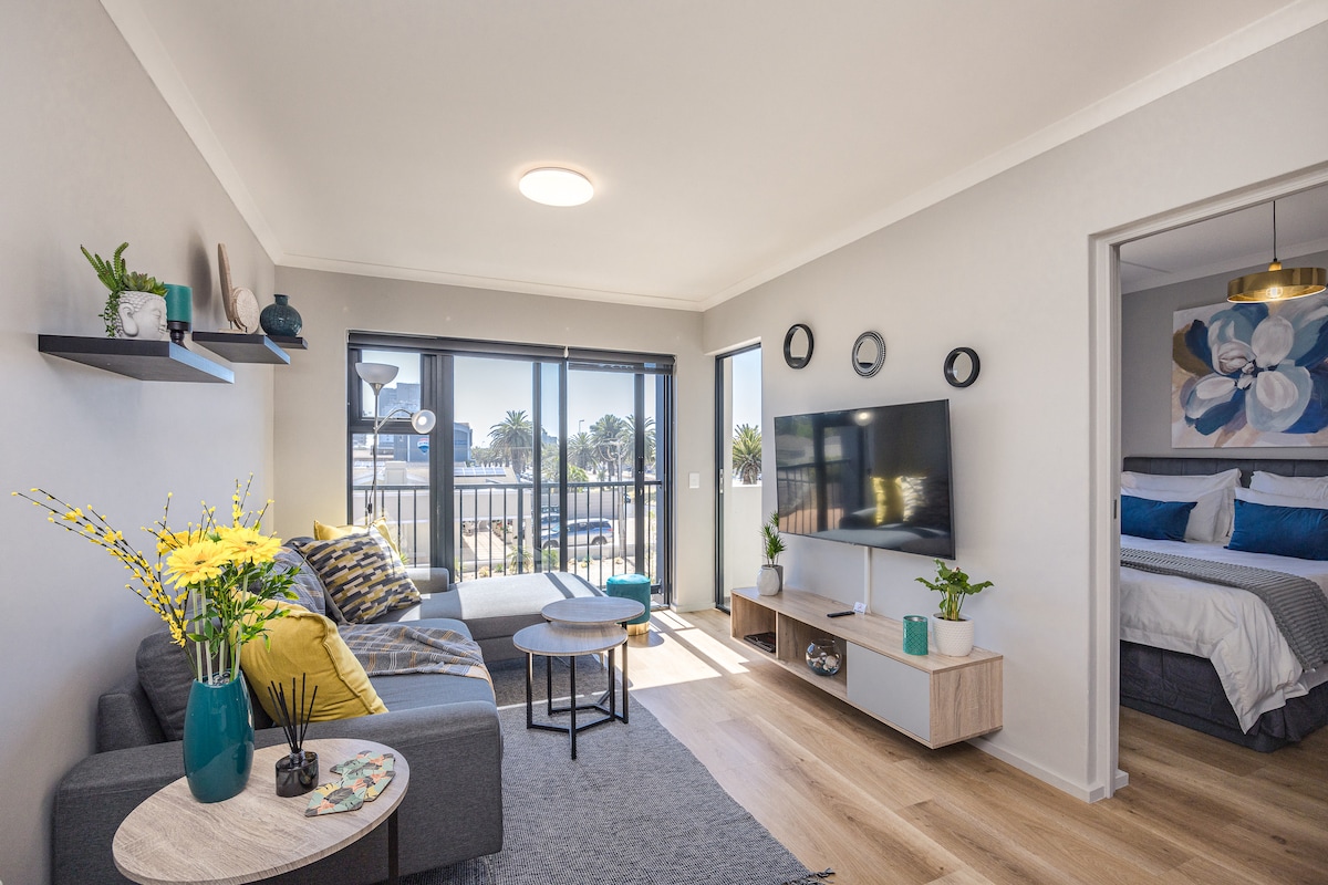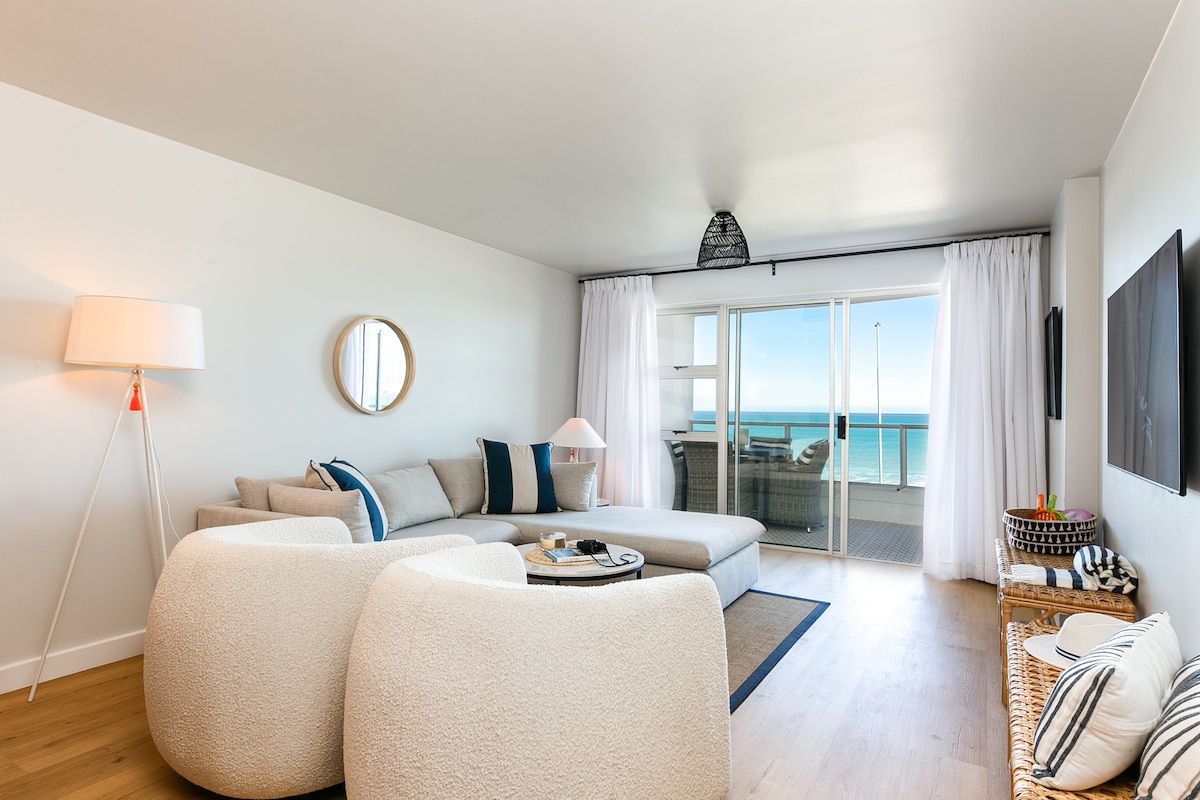 This bright and spacious one bedroom apartment boasts a breathtaking view of Table Mountain and Cape Town surrounds. It includes a queen extra-length bed, uncapped wifi, balcony, dishwasher, oven, laundry facilities, and gym within a 24/7 security-controlled building. Featuring also a BBQ area and outdoor shower for surfers. From the elevated and secluded balcony, you may observe the plentiful marine life that visit this popular beach, also enjoying world class sunsets in ultimate privacy.