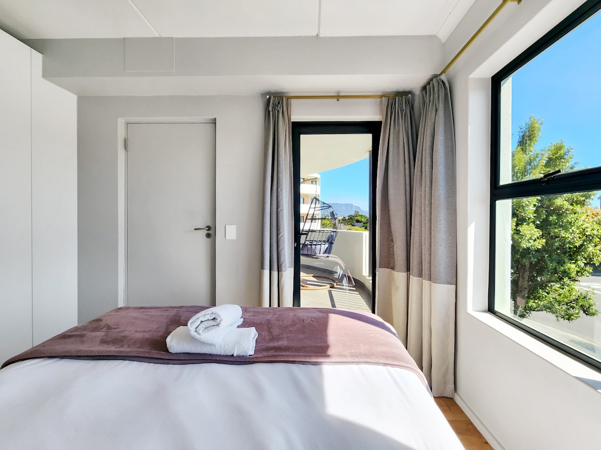 Wake up in a soft Queen-size bed in a cosy glass enclosure that opens out on to an ocean-view balcony. Modern minimalist chic beachfront apartment with uninterrupted views of Table Mountain and Robin Island. The apartment is situated in Blouberg and is 500m from the world renowned kit surfing and SUP beach.