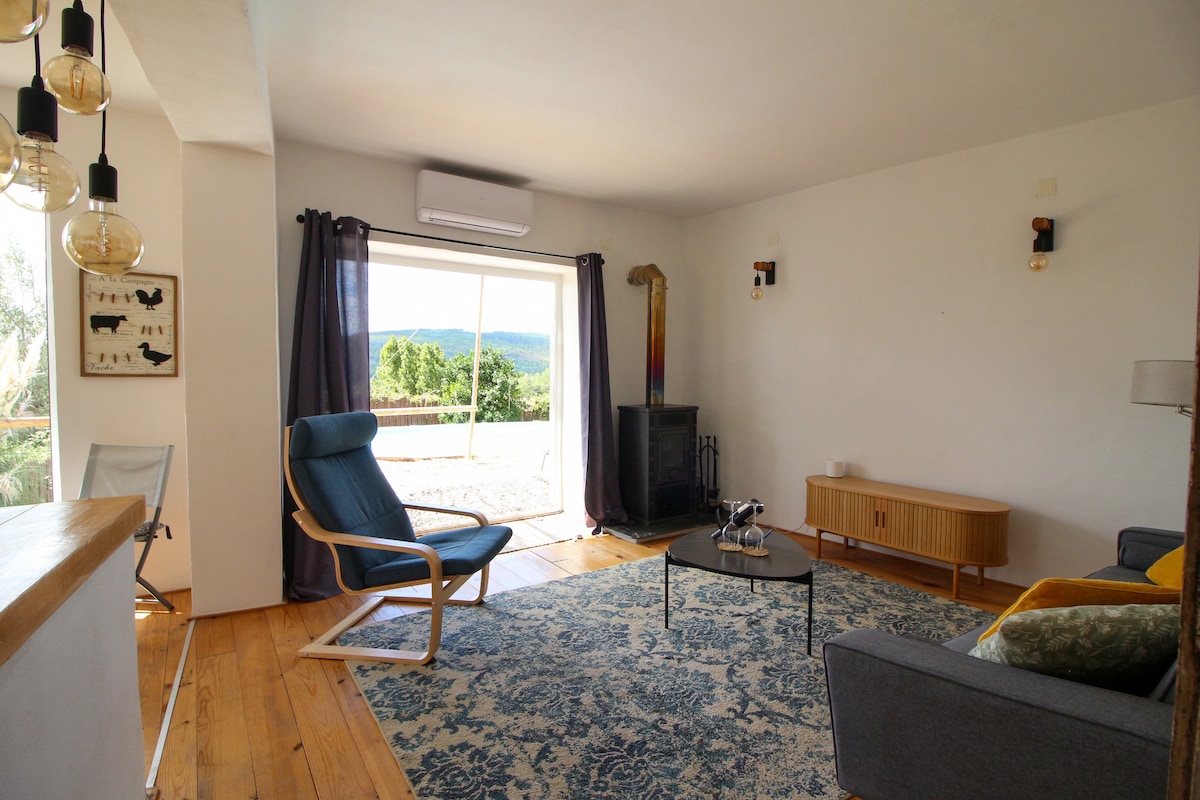 Spectacular views towards mountain, oriental fish pond, waterfall, all-weather roof swimming pool, large garden. 3 comfortable double bedrooms, 2 bathrooms, 1 en-suite. Cot/baby chair/baby bed available on request. Oven, Dishwasher, Washer, Fridge/freezer, Micro, full kitchen. Fast WIFI indoor & terrace. Cable TV, Wood burner, electric heaters. Large sunny terrace, BBQ, Sofa, Al fresco dining. Coja 10 min (shops, restaurants, pharmacy) Walks, river beaches, biking. Coimbra 50 min; Porto 2 hrs.
