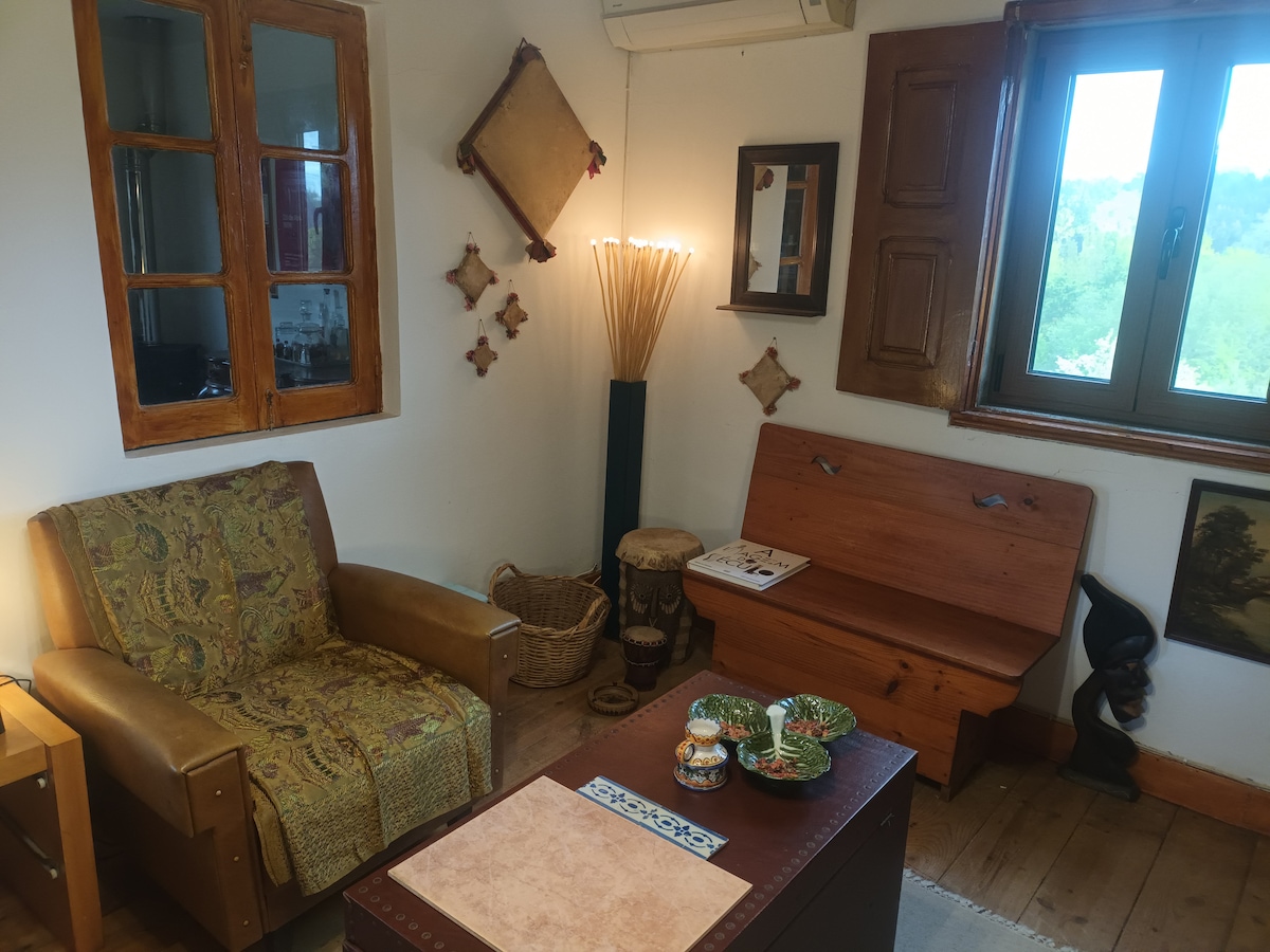 The house is located in the Mondego River Valley on walking distance of a beautifull isolated riverbeach. A great place to get away from the stressed world. Excellent for a couple or an individual who loves the simplicity, purity and silence of nature. The house includes an open kitchen and living room, a 11 m2 mezanine for sleeping, an outside shower, compost toilet in a 5000 m2 forest garden with granit boulders, natural structures, sculptures and chillout places.