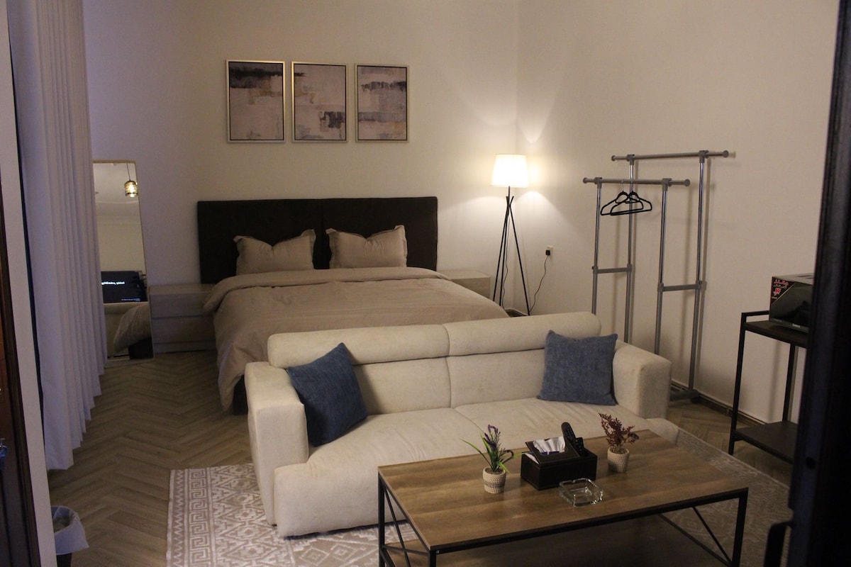 استرخ في هذا المسكن الفريد والهادئ ، ستديو بغرفة نوم خاصه يسع لشخصين . يتوفر فيه جميع المسلتزمات المتعلقه بالسكن من : - مطبخ خدمه صغير يتكون من ( مايكرويف ، غلاية ماء ، آلة قهوة لتحتسي قهوة هادئ ) - غرفة نوم بسرير كينغ مع خزنة ملابس ، ايضا تلفزيون ذكي بشاشة مسطحه مع اريكه دائره مصممه بشكل عصريه . - حمام مخدوم بجميع الأدوات اللازمه . يتسع المكان الى شخصين . يمتاز المكان بوجوده في منطقة حيه على شارع تجاري وقريب جدا من الكافيهات والمطاعم وايضا المطار .
