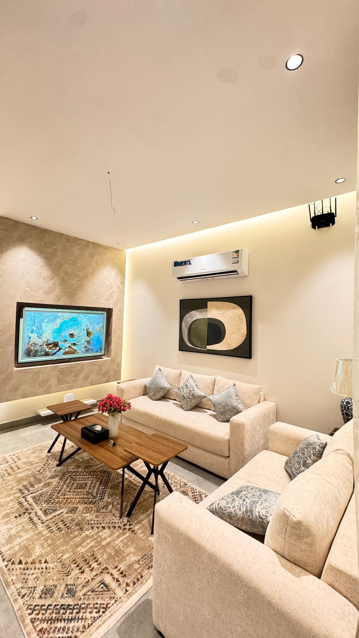 استرخ في هذا المسكن الهادئ والأنيق الذي يقع على شارع تجاري وتحيط بك الاسواق والكافيهات والمراكز التجارية تتكون من صالة وغرفتي نوم الاولى ( بسرير كينغ سايز ) والثانيه ( بسريرين مفرده ) ومطبخ كبيره وحمام . تتميز بسهولة الوصول لأشهر مراكز التسوق والمطاعم والترفيه في مدينة تبوك وكما تبعد عن مطار الأمير سلطان بن عبدالعزيز 10 دقائق . تتسع الشقة الى إقامة 4 الى 5 اشخاص مبيت واستضافة 3 اشخاص كضيوف زيارة . حتما ستجد كل ماتحتاج لإقامه رائعه ومتكامله . ملاحظة | غير مخصصه للعوائل الاكثر من 5 اشخاص