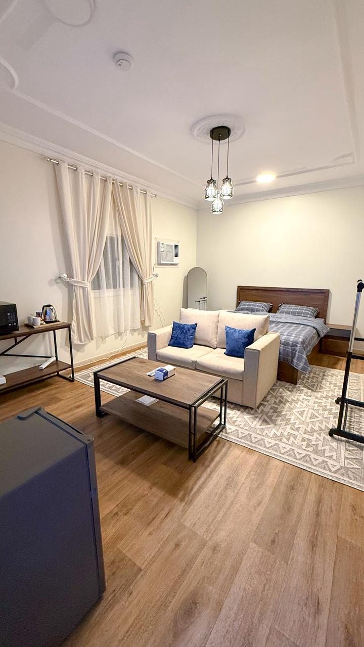 Enjoy a comfortable stay in a modern studio featuring a cozy king-size bed, a chair, a table, and a mini fridge. The studio also includes a private bathroom, a split air conditioner, a wardrobe, and a TV. Conveniently located in Al-Mahrajan district, opposite the Eid prayer area, with easy access to Boulevard (6 minutes), Tabuk Park Mall (5 minutes), and the airport (15 minutes). Book now for a unique and comfortable experience!