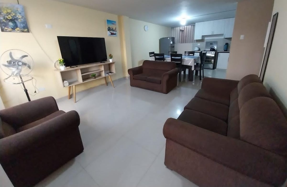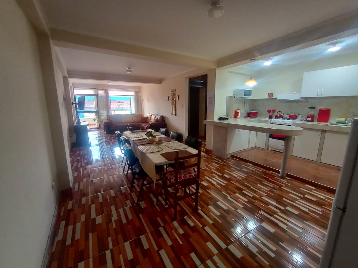 Departamento familiar 1 er. Piso,céntrico : próximo al centro cívico , 4 habitaciones( 3 camas matrimoniales + 2 camas individuales) 2 baños con ducha -agua caliente + un baño adicional +1 cochera gratis. Capacidad : 8 H. muy cómodos , Cocina equipada, Sala comedor, lavandería, patio interior recreativo, patio exterior con cámara . Transporte público en la puerta. Rodeada: Clínica La Luz y H. Solidaridad, Sauna con piscina, Restaurantes, bodegas, gimnasio, supermercado, parque etc.