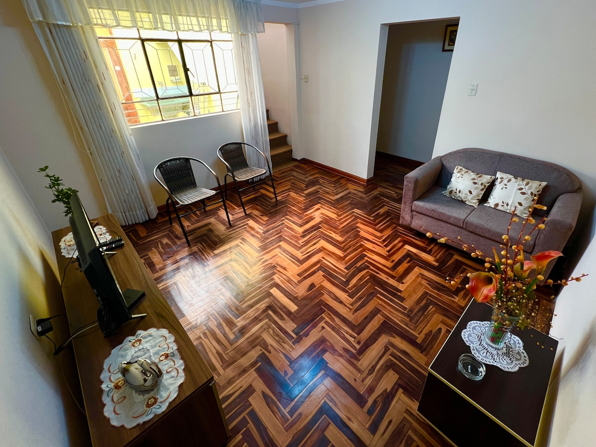 Bonito y amplio departamento ubicado a tan sólo 7 minutos a pie desde Plaza de Armas , en una zona tranquila y segura a una cuadra del supermercado Plaza Vea, Cine Planet, restaurantes, bancos, farmacias, etc. Cómodas habitaciones, cocina amplia equipada y Tv con tus plataformas digitales favoritas (Netflix, Youtube, etc). Además cuenta con lavandería y terma a gas. No tiene ascensor. No pierdas la oportunidad de vivir en este acogedor lugar como si estuvieras en casa .