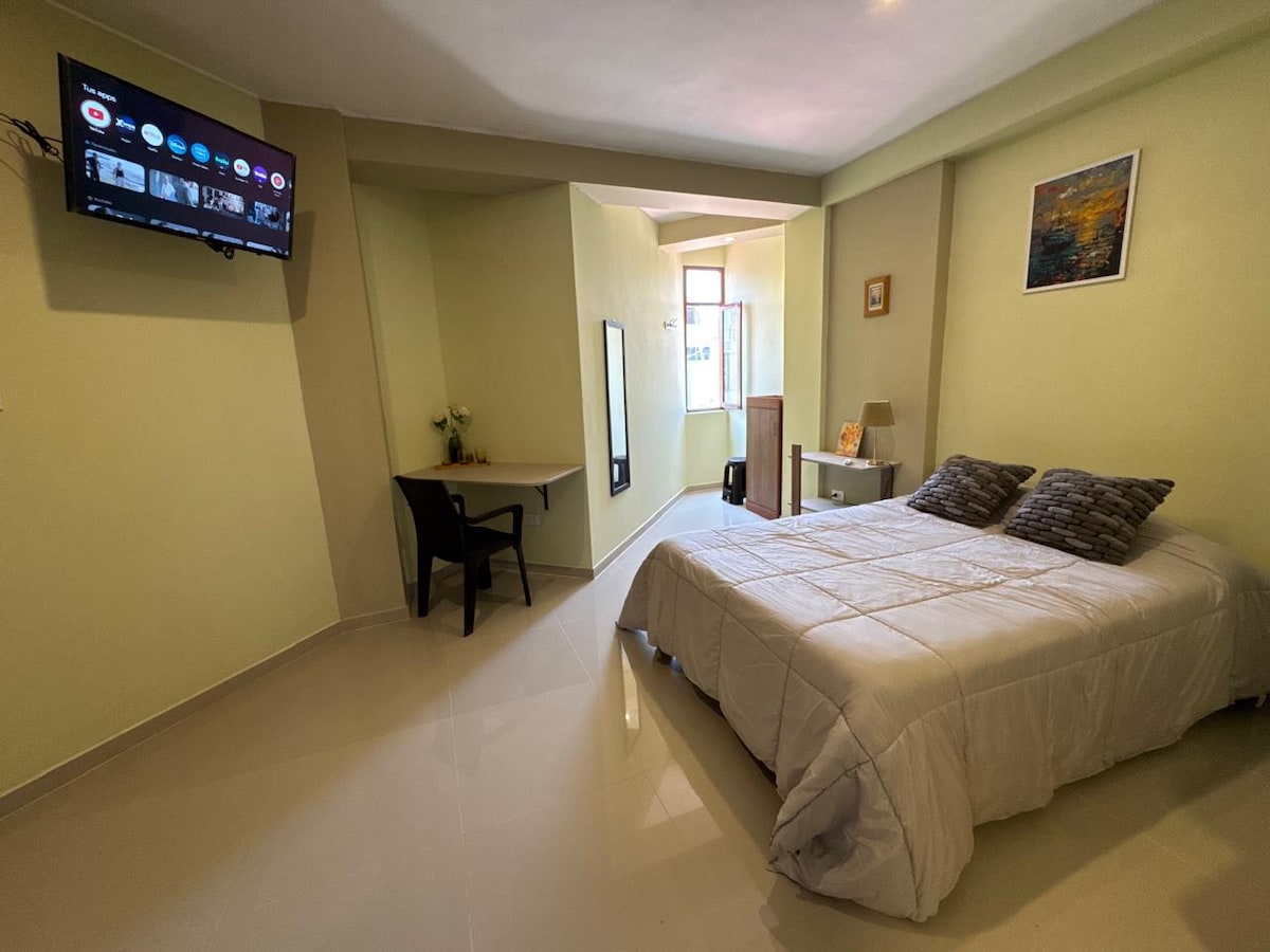 Cómodo estudio en primer piso (es interno, no tiene ventana a la calle, tiene ventana hacia un pasaje), con cama queen size, Smart TV de 40" con cable, cocina americana equipada con refrigerador, microondas, licuadora y menaje. Baño con tina. Especial para personas solas o pareja. En edificio con ingreso independiente, a 5 minutos del centro (caminando).