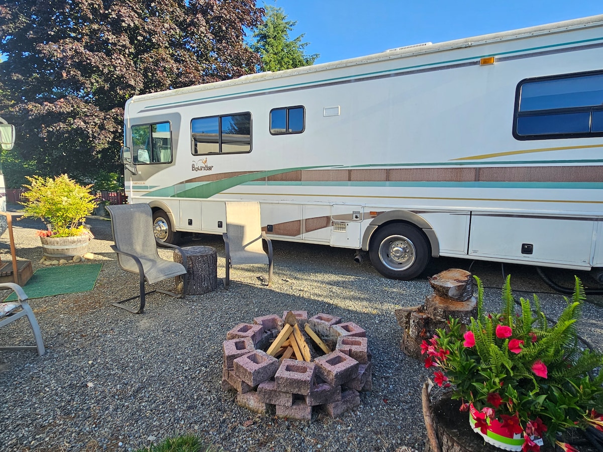 35 ft. Fleetwood has all the amenities. Kitchen, refrigerator and freezer, dining table, bathroom, master bedroom and convertible couch. Close to the airport, close to downtown, very quiet neighborhood with no traffic going by. Private yard with deck, propane BBQ, fire pit and hot tub included. If you like a lush garden setting this is for you.