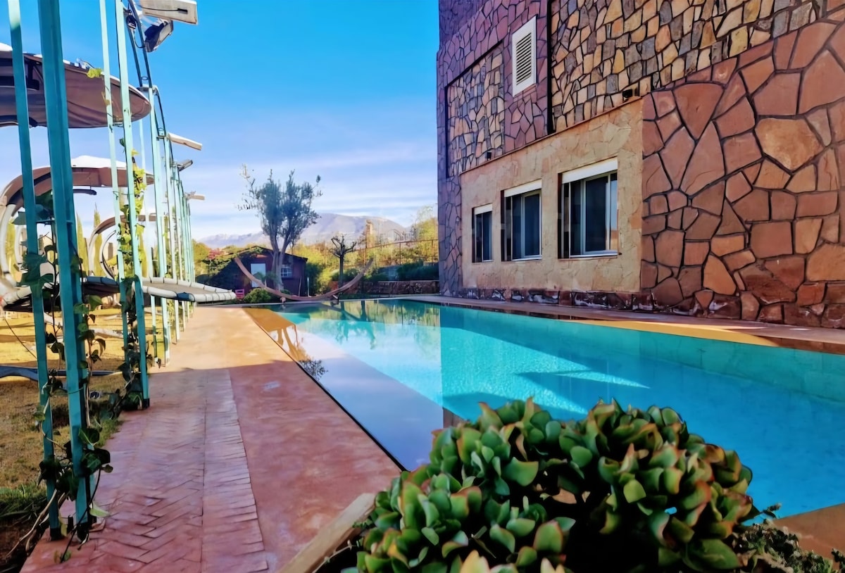 Villa de campagne dans un village calme et paisible, où vous pourrez vous déconnecter du monde de la ville. Profitez des espace extérieur, rafraîchissez vous au bord de la piscine avec vue imprenable sur les montagnes, ou réchauffez vous au coin d’un feu. La villa est situé à quelques minutes des cascades d’Ouzoud, et à quelques minutes de la source des cascades, ou vous pourrez déguster un verre de thé rythmé par le son de la rivière .