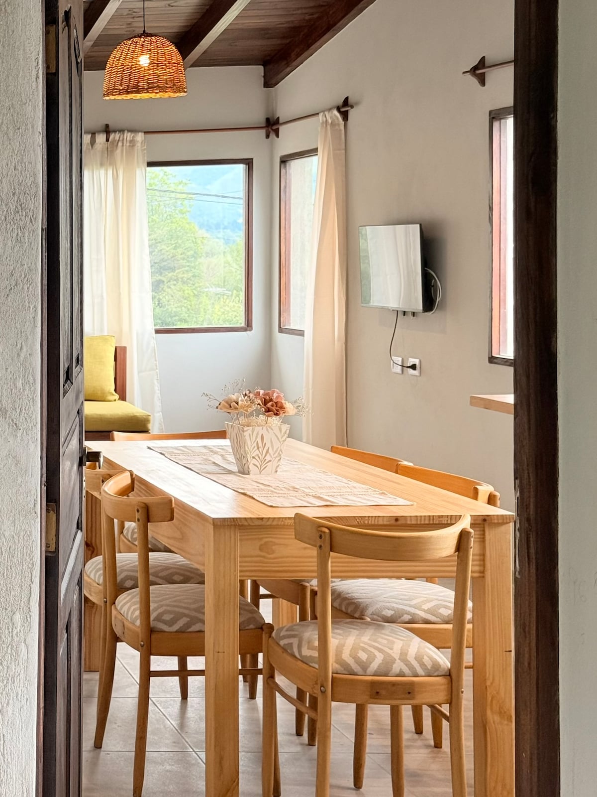 El loft es un gran ambiente que conecta sala, comedor, dormitorio y cocina en una sola área. Rodeado de ventanales. Para 4 persona: una cama matrimonial y un sofá cama muy cómodos. Es una unidad independiente en la planta baja de una casa para 11 personas. Tiene acceso , wifi, y calefón propio. Una kitchenette equipada y un baño amplio. A 6 min del centro en auto y 30 caminando. Desde el ventanal podrán ver el valle de Tafí con todos su matices.