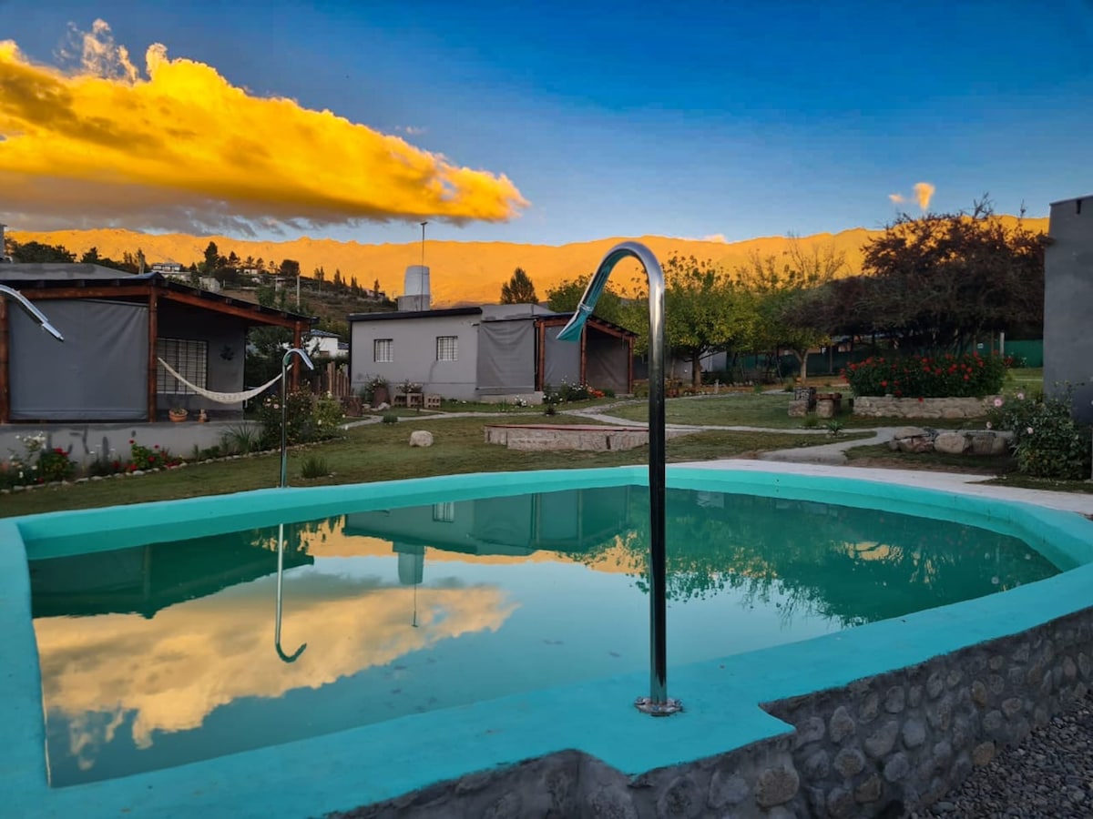 Fire pit, barbecue area with grills, smoker, and clay oven. Games and giant Jenga, hammocks, and outdoor lounge chairs. Picnic areas with rocket stoves. Heated pool with jets and waterfalls. Fruit trees and an aromatic garden. Exclusive property with only 2 cabins (sleeps 2 to 8 guests). 450 m from the river and 2.3 km from the La Cruz trail. Nature, views, and true relaxation in Tafí del Valle.
