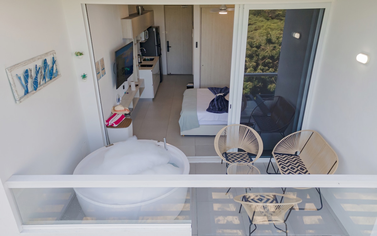 Aparta suite en Porto Horizonte piso 14, hermosa vista donde te relajarás en pareja, podrá disfrutar de un masaje en pareja en este Jacuzzi viendo el atardecer al fondo con el mar caribe de complice. Cama tipo queen con un TV 55’ donde podrás disfrutar tus series favoritas. La suite cuenta con cocina equipada para que puedas preparar un rico desayuno y te tomes un cafe en la mañana. Agua caliente y todo lo necesario para estar tranquilos. El edificio está equipado con una increíble piscina!