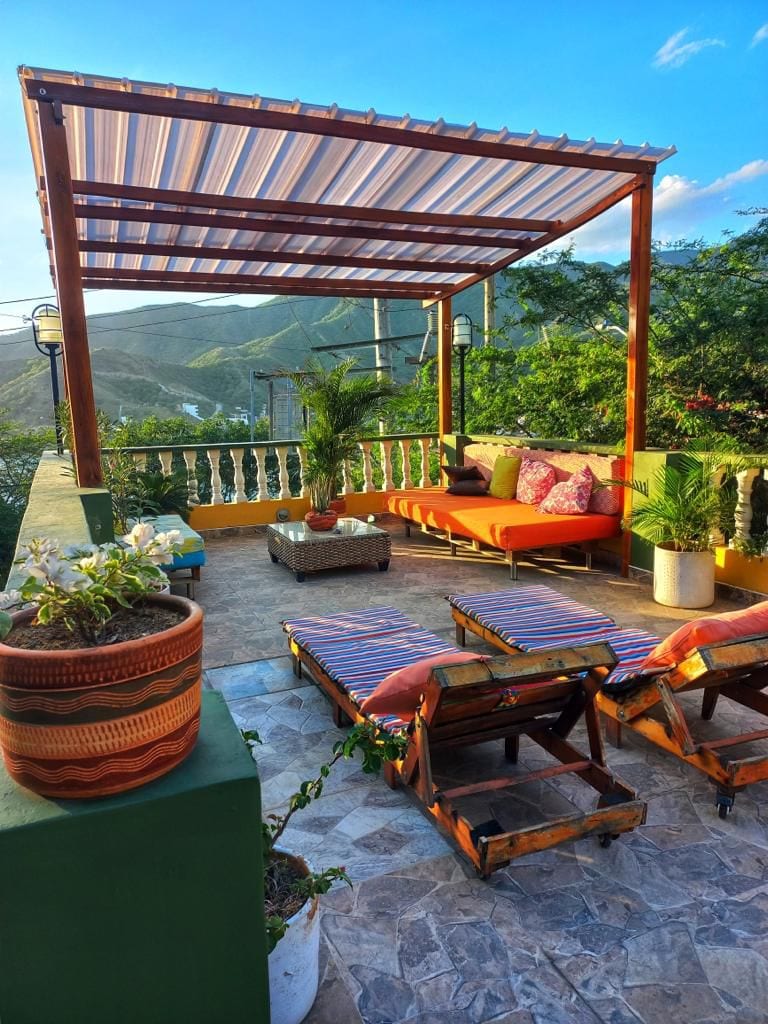 "Nuestro acogedor hostal está ubicado a solo una calle de la playa, ideal para quienes buscan relajarse y disfrutar del mar. Las áreas comunes ofrecen impresionantes vistas tanto a la bahia de Taganga como a las montañas. Contamos con piscina, mesa de billar, restaurante y bar para una experiencia completa de descanso. La habitación doble privada incluye un delicioso desayuno y baño privado, brindando comodidad y privacidad para una estancia perfecta."