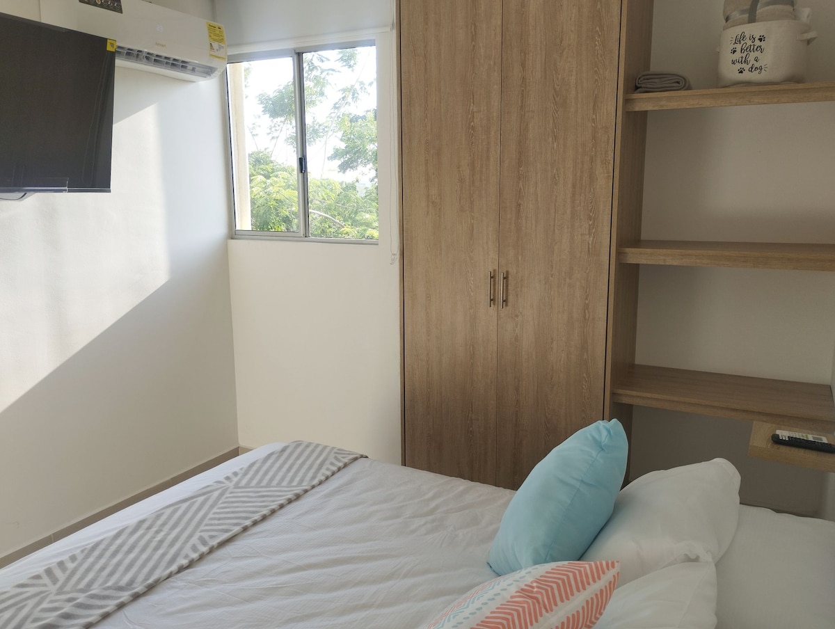 Apartamento con buena ubicación, de 1 habitación con cama doble y cama sencilla, cuenta con baño, terraza (apta para motocicleta), cocina con (nevera, estufa, platos, cubiertos, ollas, jabón, sal, etc.) y zona de lavado. Cuenta con Aire acondicionado, ventilador, Netflix y Wifi. Ubicado en zona residencial y central de Santa Marta, cercano a supermercados de cadena D1, ARA y Olímpica. a dos calles puedes tomar cualquier bus para dirigirte al centro histórico, al PN Tayrona y al rodadero.