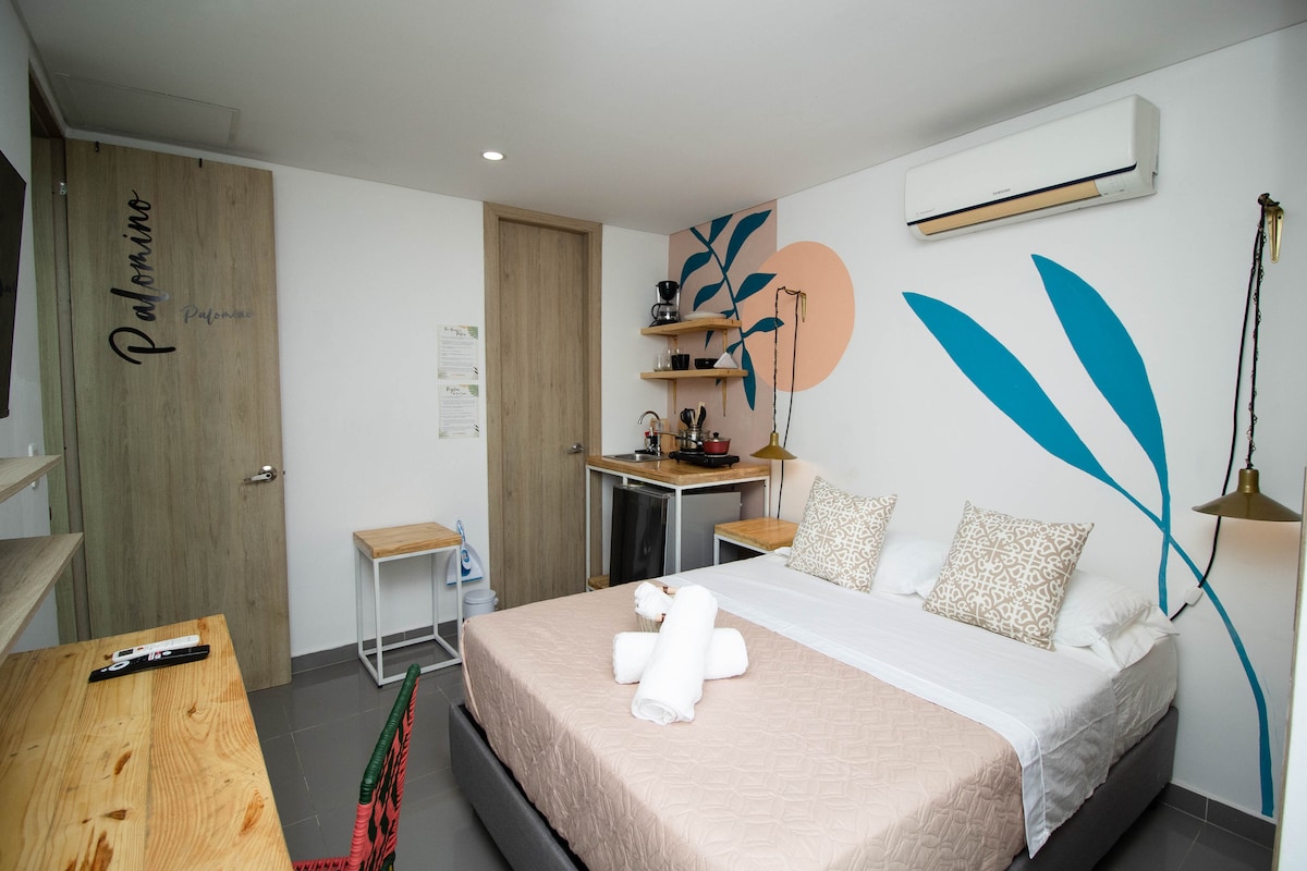un exclusivo mini apartamento con entrada privada, se encuentra en el primer piso de casa mandala taganga , el espacio es cómodo y limpio, con baño privado, mini cocina, zona para trabajar ,ventilador, decorado con piezas de ecoart, luz solar para wifi ,ayudando al medio ambiente. ideal para estancias largas. En estancias largas se incluye la lavanderia y limpieza cada semana. Damos descuento en cursos de buceo. una experiencia unica a solo 5 minutos de la playa.