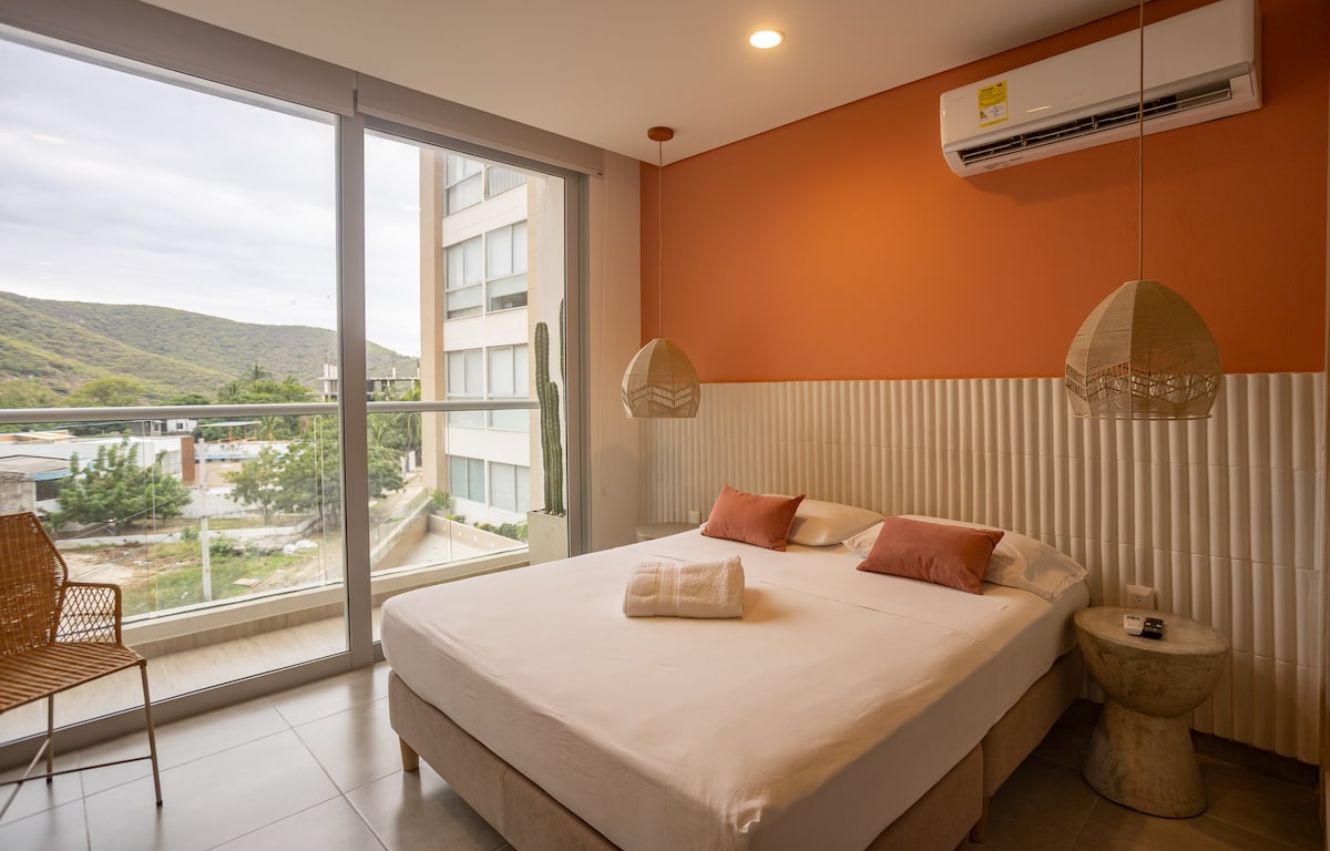 Wake up to the sound of the sea and enjoy Santa Marta’s most magical sunsets from the balcony of this bright, elegant apartment. Located on the 13th floor of the exclusive Grand Marina Apartasuites, with access to the spectacular AC Marriott hotel pool. The building also features its own gym and sauna. Modern, stylish, and full of light, with a fully equipped kitchen, workspace, fast Wi-Fi, and private parking — your perfect home by the sea.