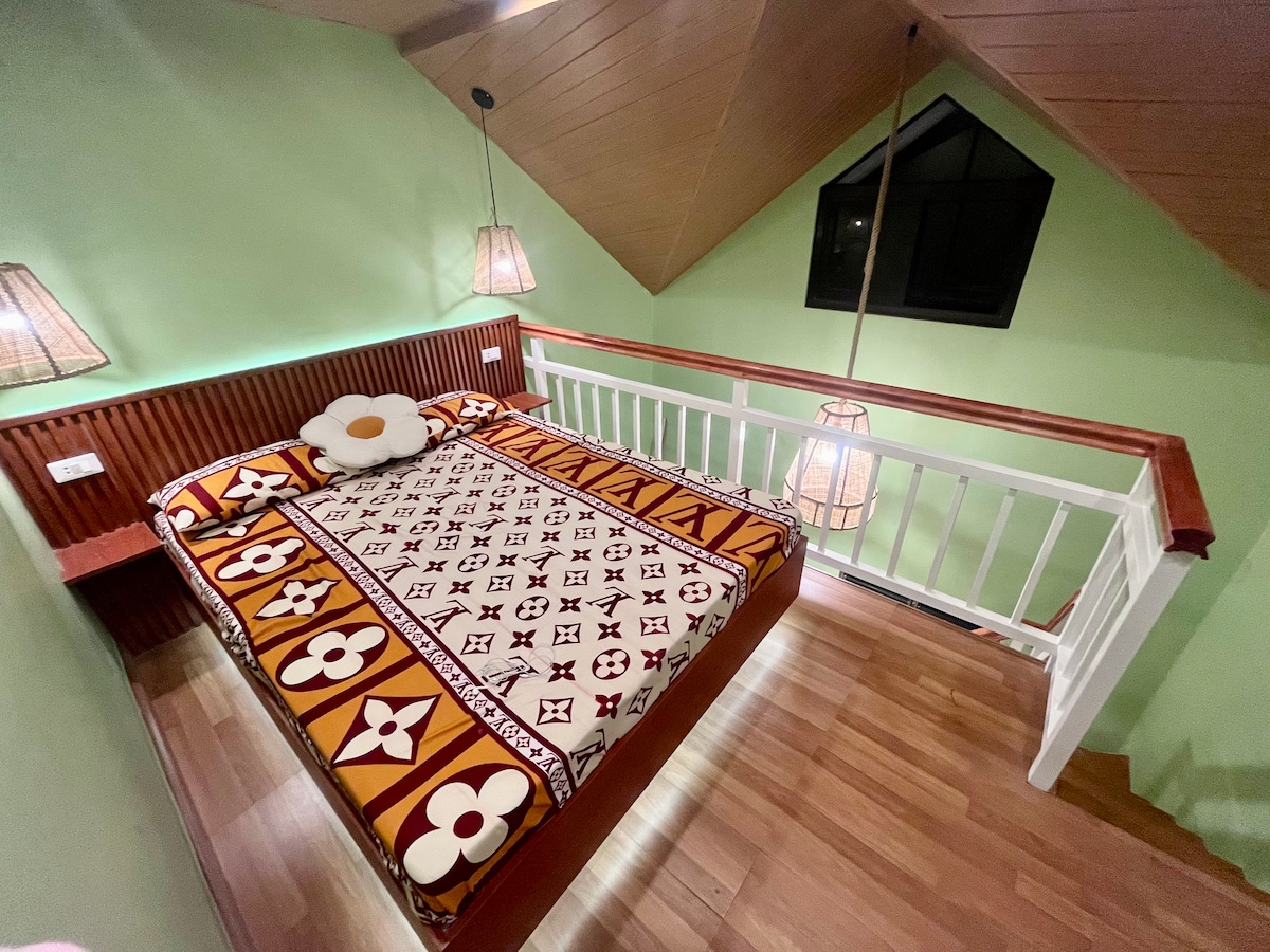 Relax in a logcabin-inspired duplex unit with 2 actual bedrooms and a spacious attic converted into a 3rd bedroom. It is a family home with fast internet, Cable TV, landline, air conditioned bedrooms, heated showers, full kitchen, Netflix, and open parking for 2. It is perfect for families who want a safe and quiet place to bond in. There is no Taal view from here, but the neighborhood is beautiful, lined with pine trees.