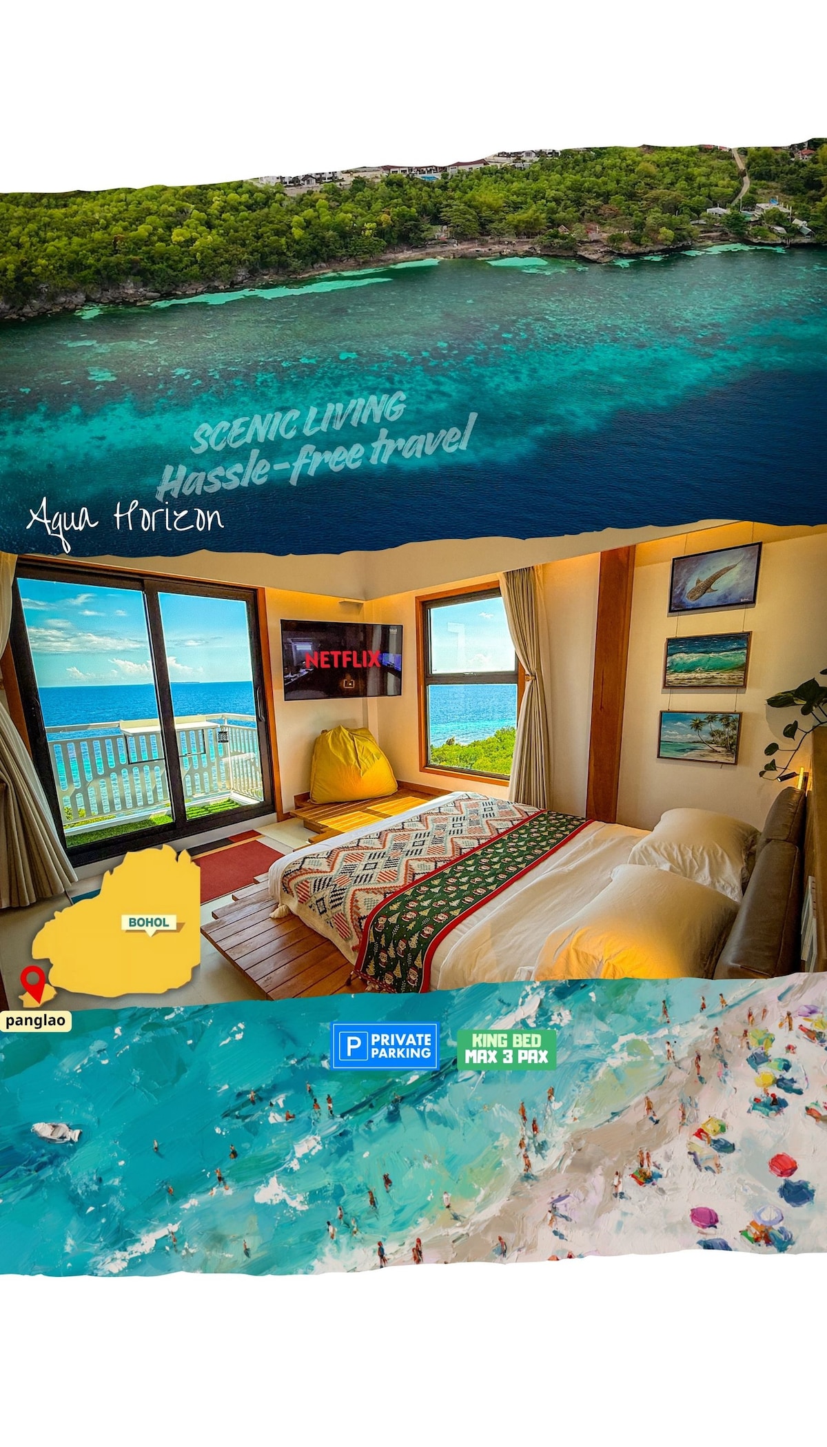 Designed by top-tier interior designer, this stylish seaview loft blends modern elegance, comfort and fucntionality- all just 50 meters from the shoreline. The unit offers panoramic view where you can see the sunrise over Pamilacan Island. It also features fully equipped kitchen, ultra-fast wifi, 50-inch smart TV, perfect for movie nights. Conveniently located just 12 minutes from Panglao Airport, this loft is the perfect seaside retreat for travelers who appreciate both style and serenity.